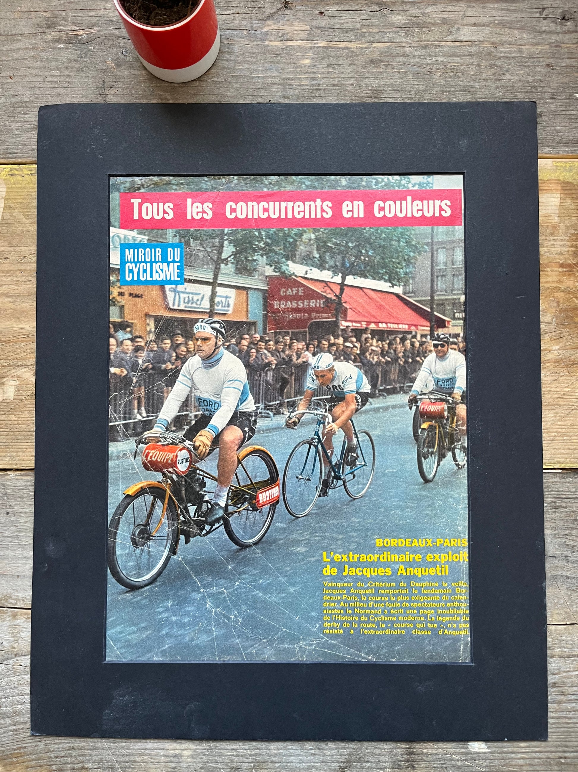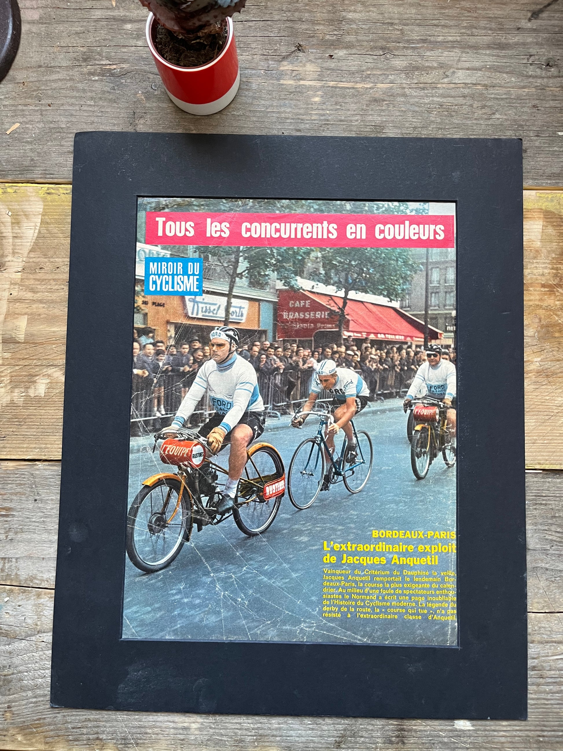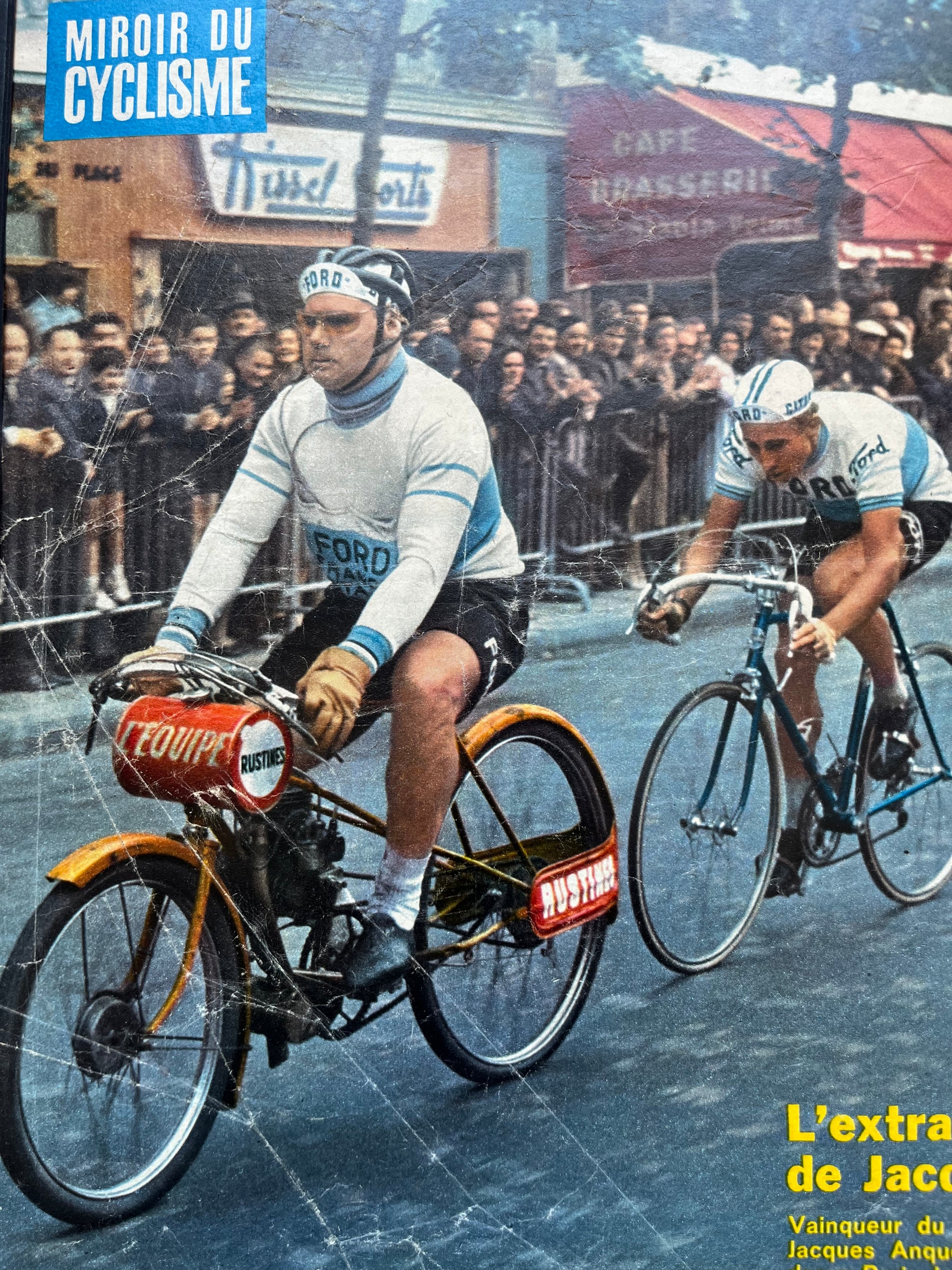 Iconic and very rare Original french cycling magazine print featuring cycling legend Jacques Anquetil competing in the Tour de France in Ford / Gitane team kit in 1965.