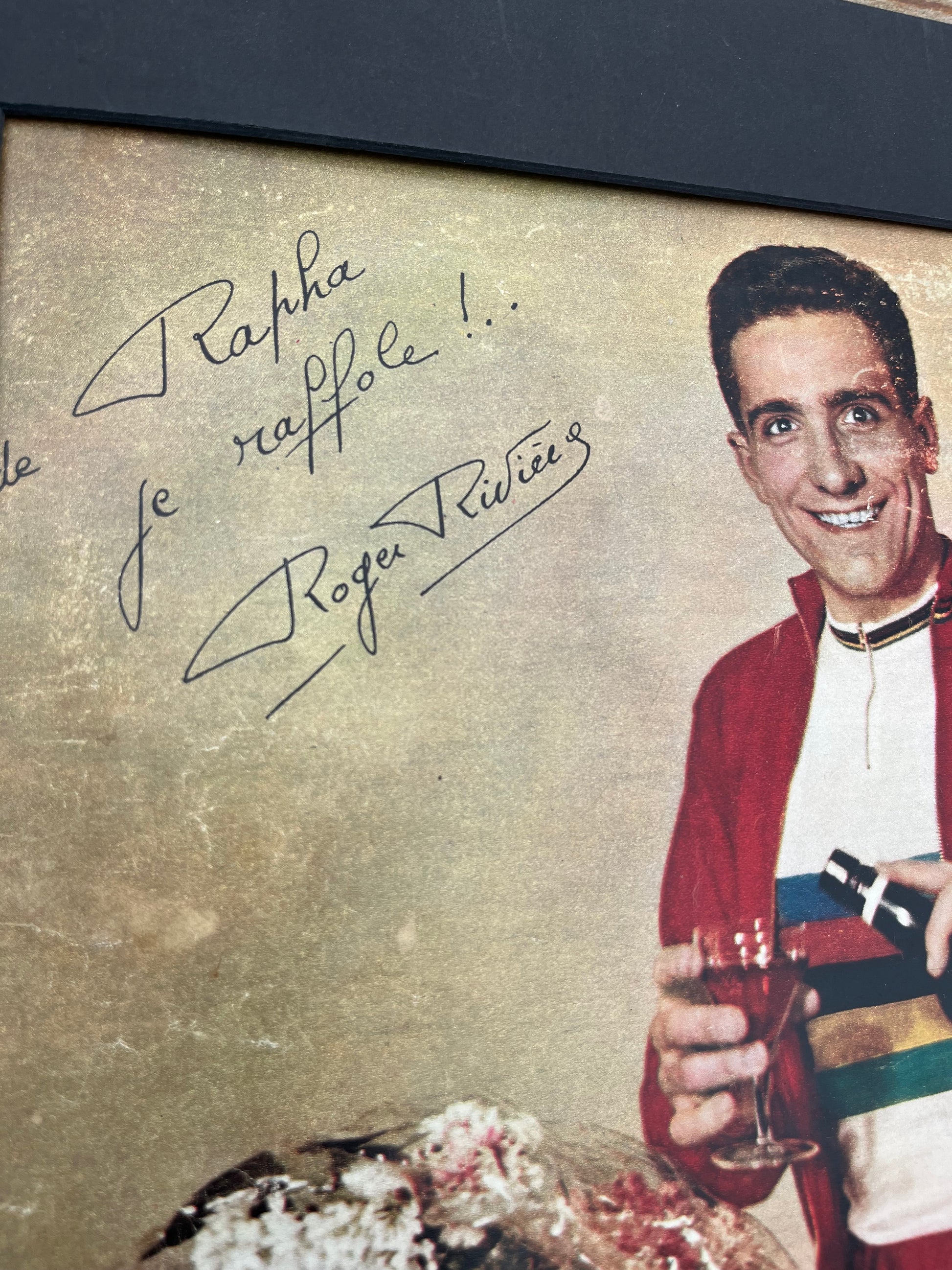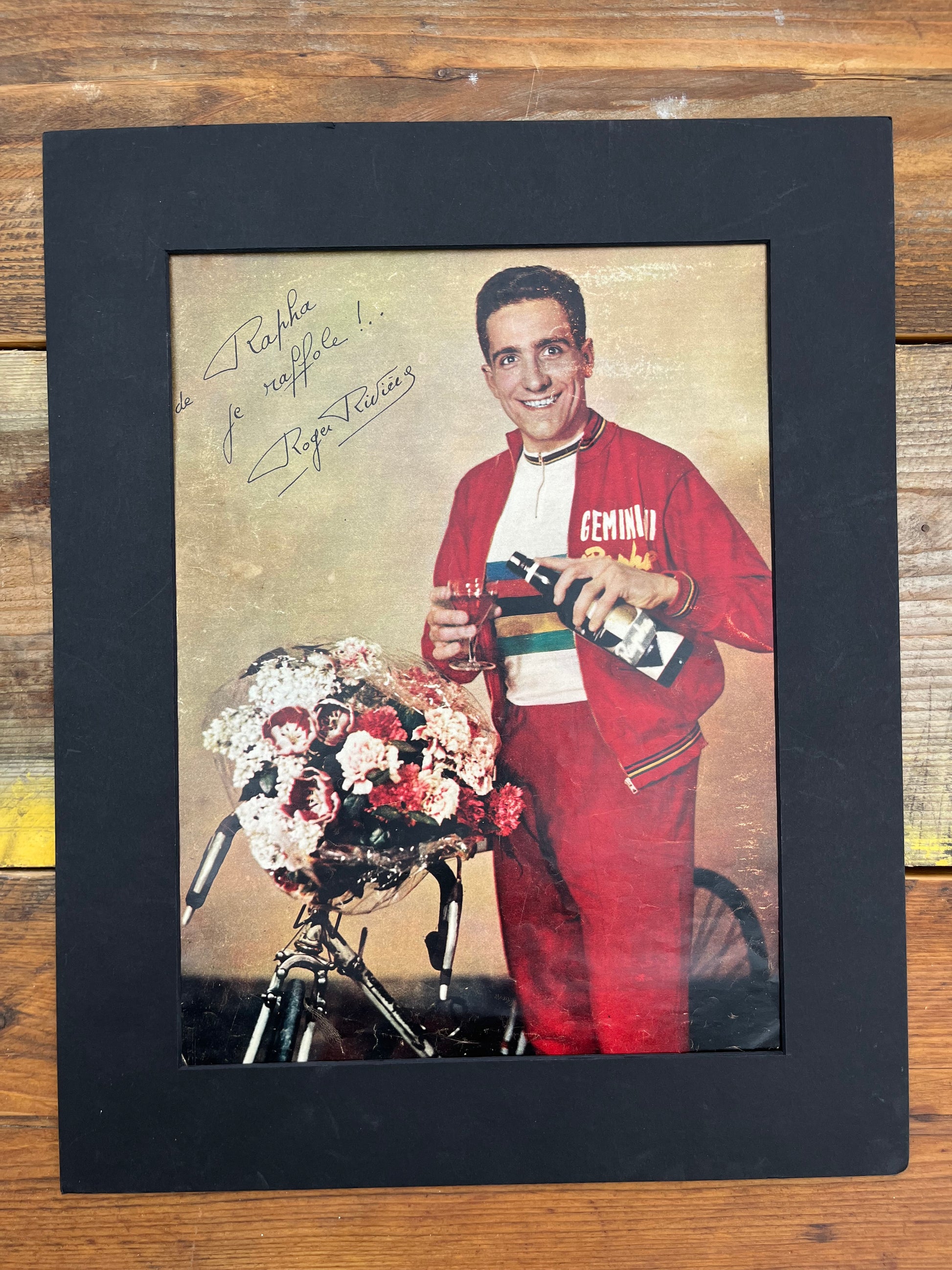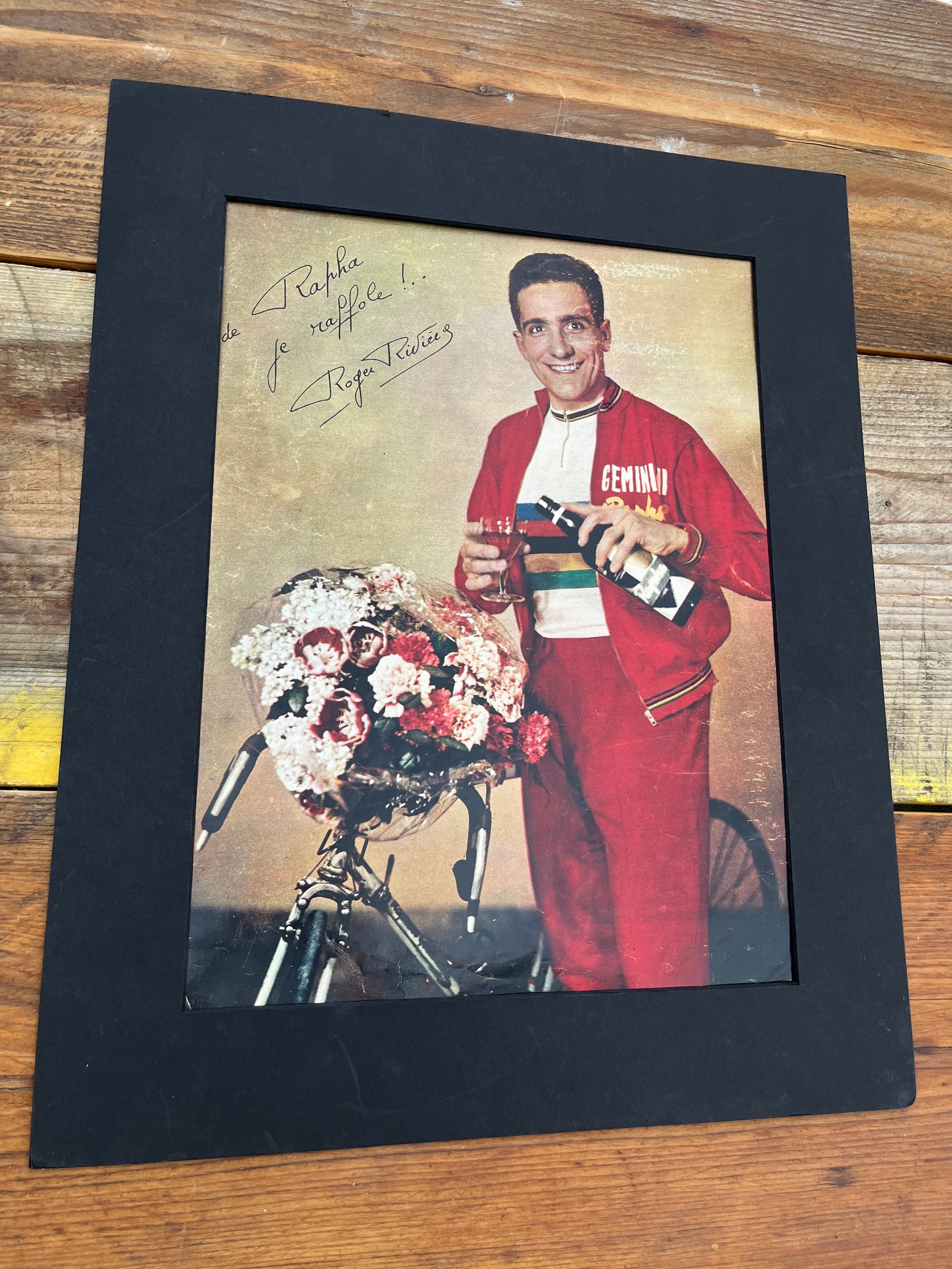Iconic and very rare Original 1960 French cycling magazine print featuring Roger Rivière in St Raphael team strip. From an original magazine and signed (printed signature) by Rivière.
