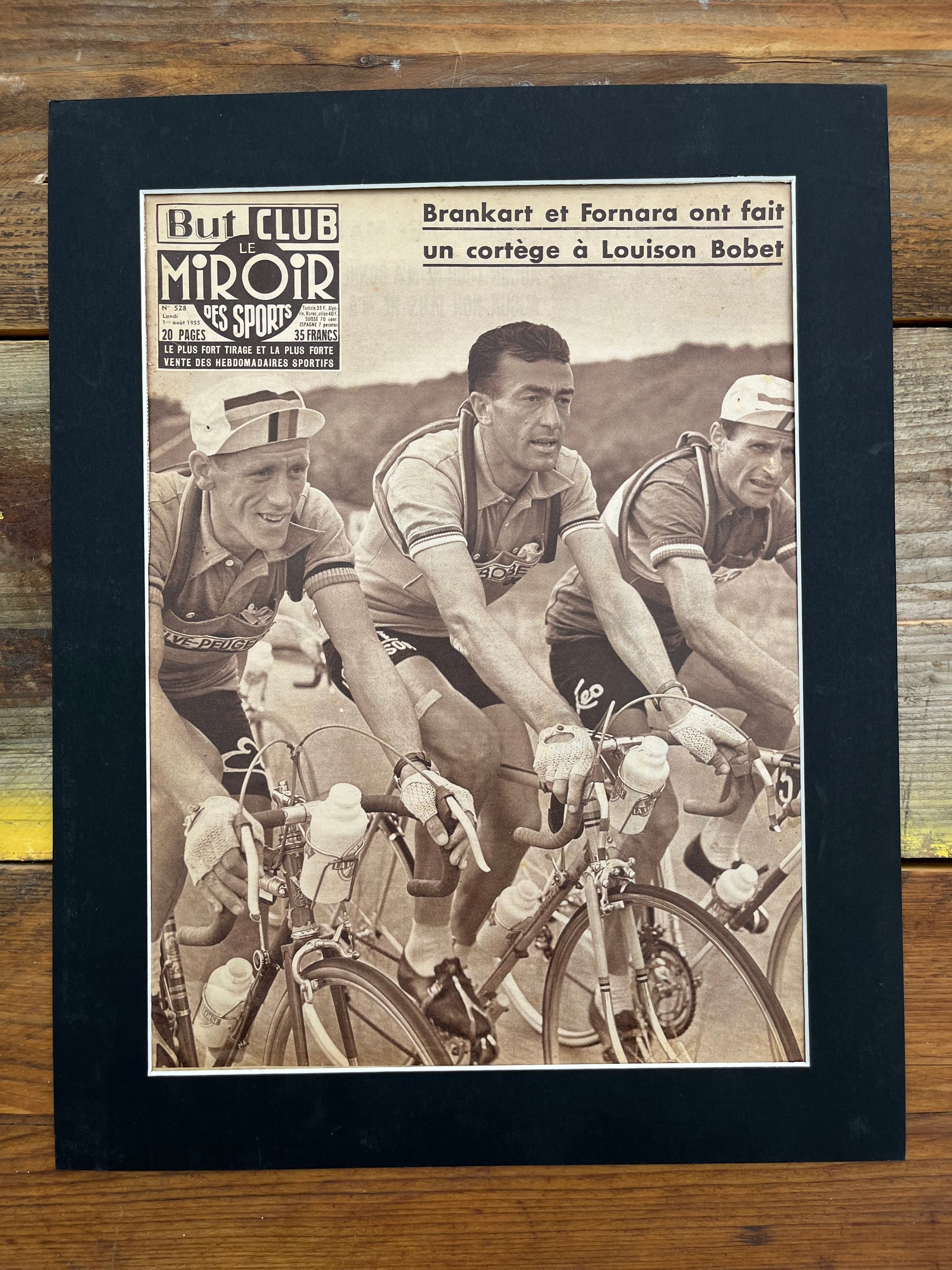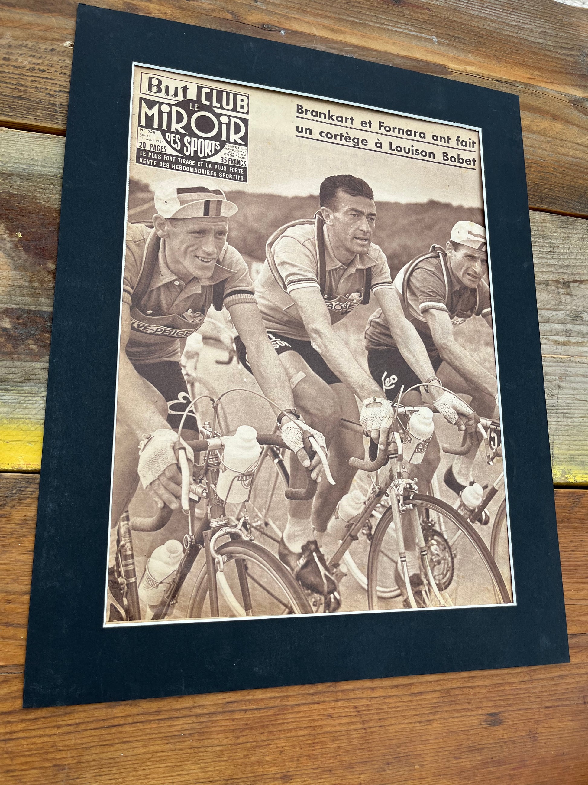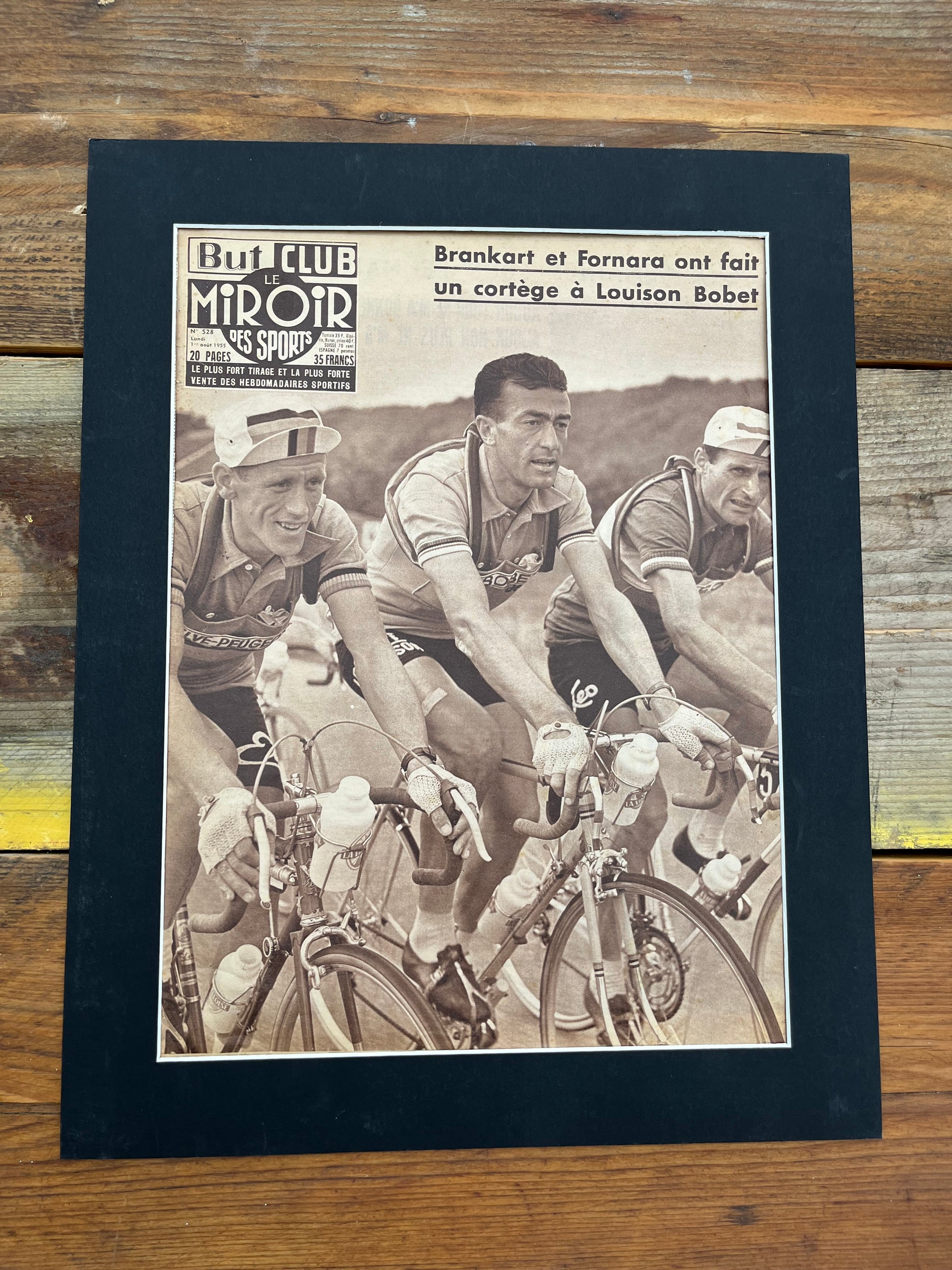Iconic and very rare Original 1955 French cycling magazine print showing Louison Bobet lriding alongside two other riders (Brankart, Fornara)