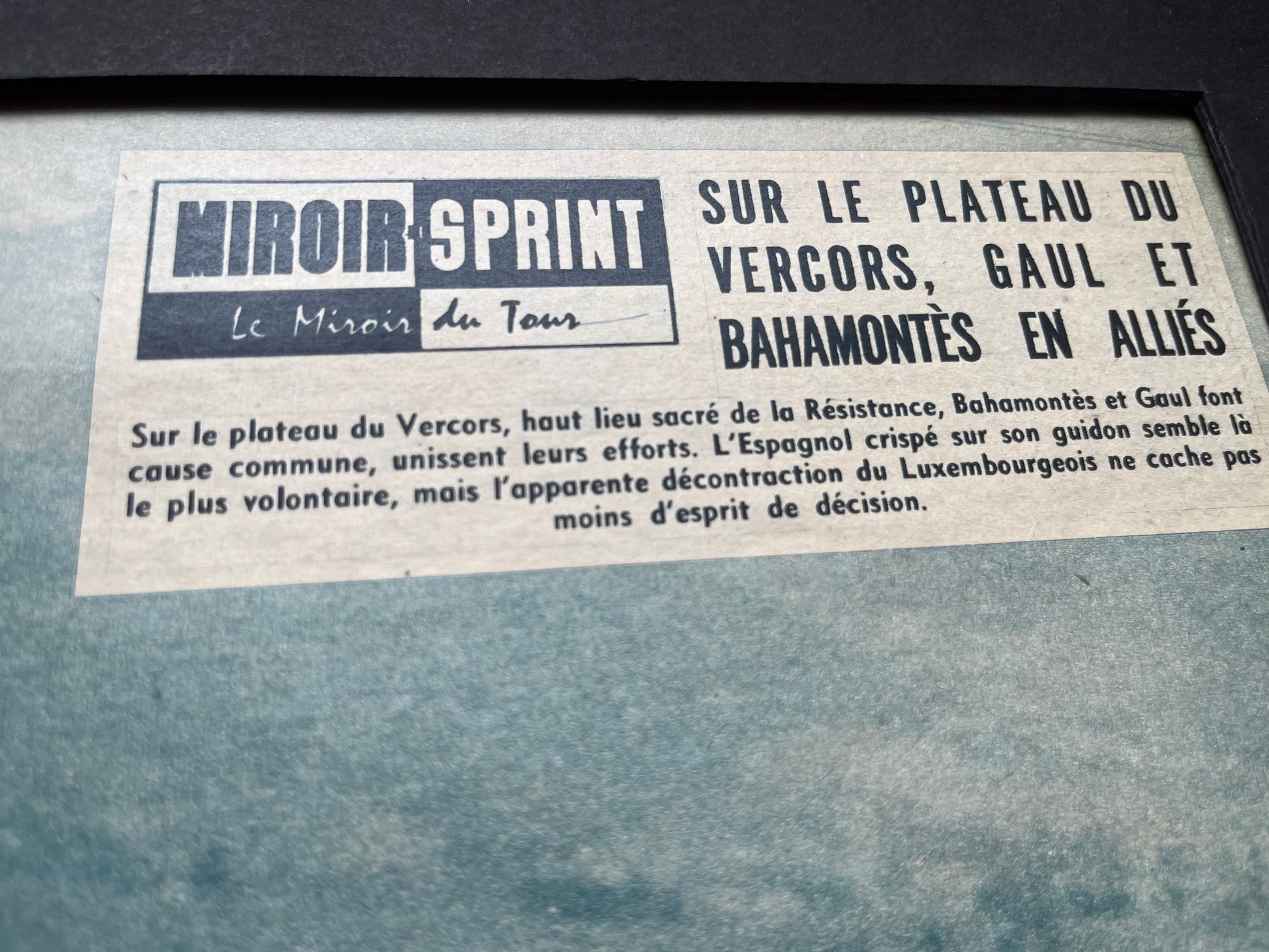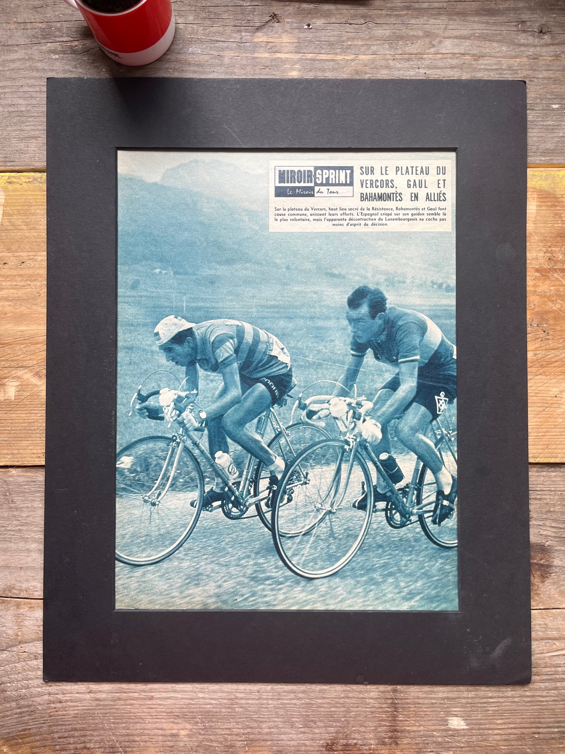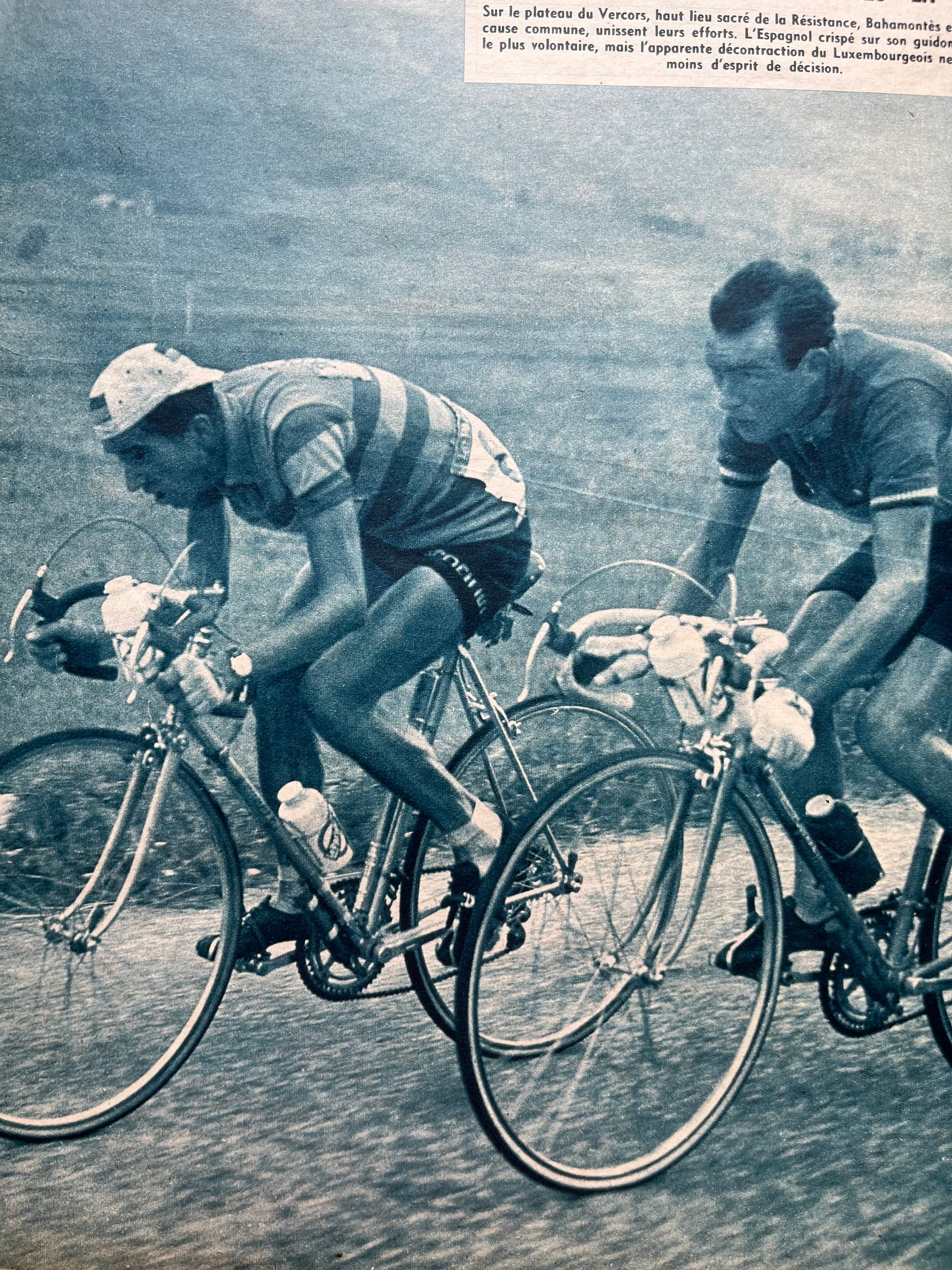 Stunnimg and rare original 1959 cycling magazine print featuring Charly Gaul and Federico Bahamontes on a stage of the Tour de France around the plateau de vercors. A charming and top quality piece of photography!
