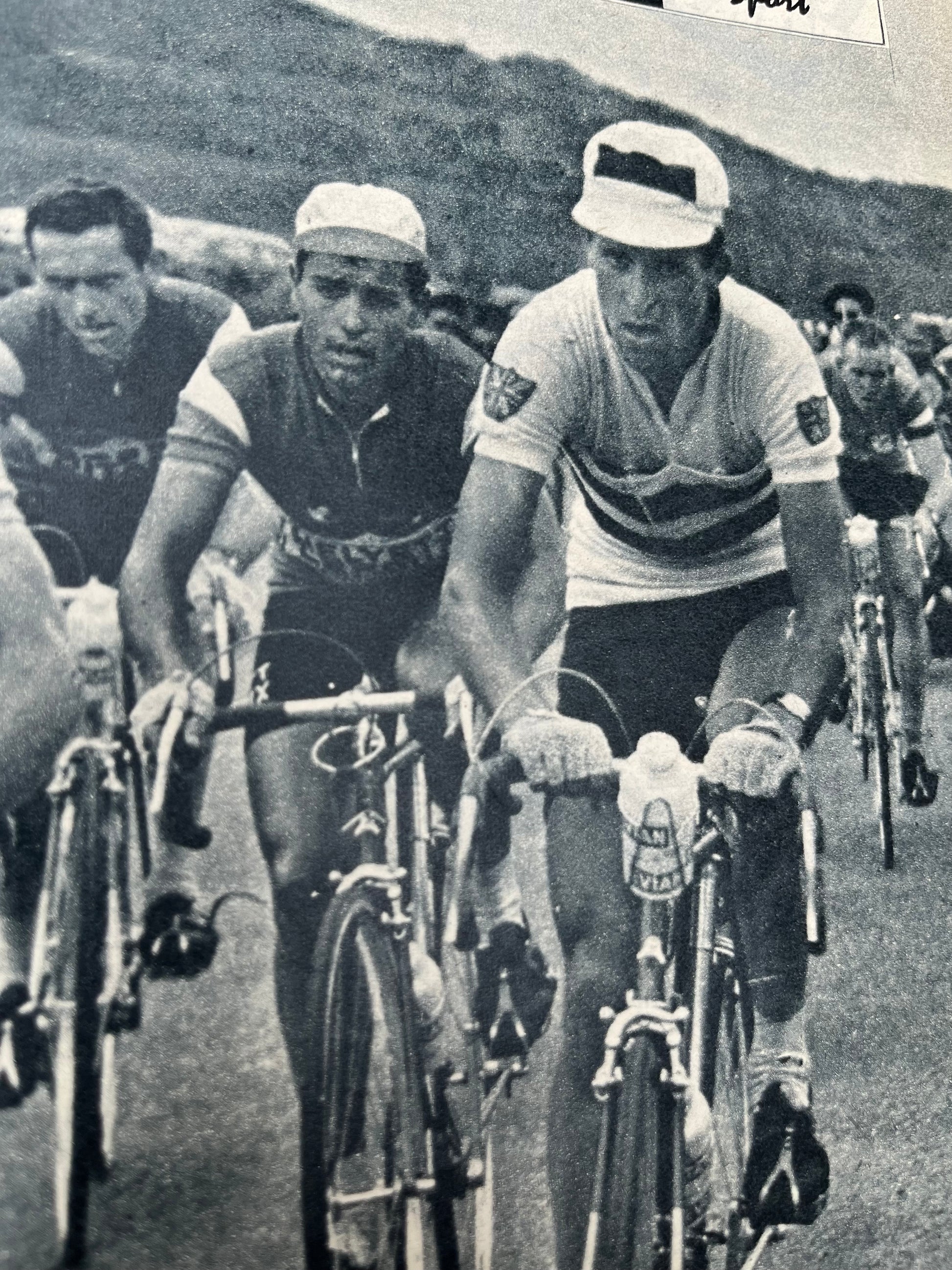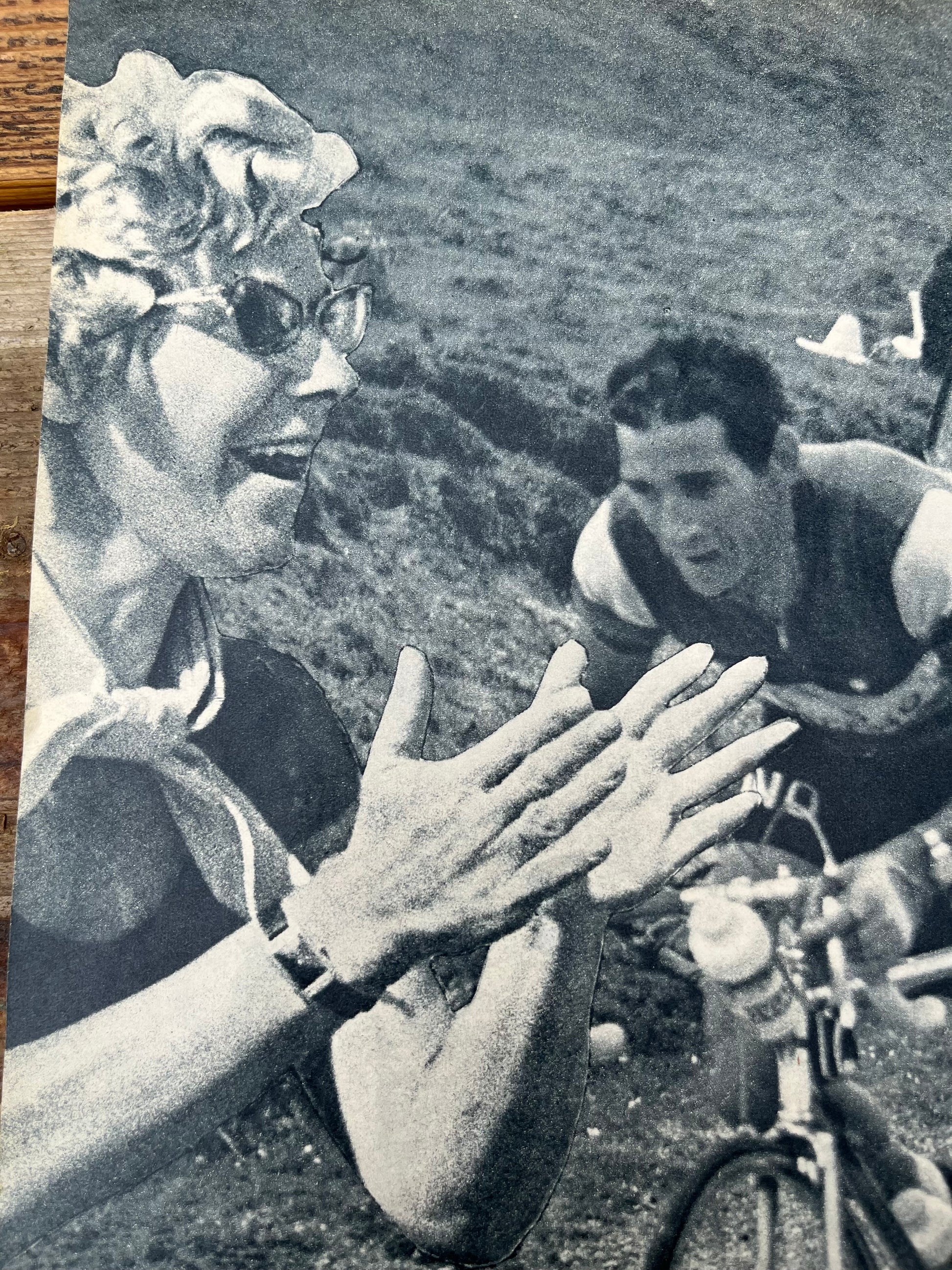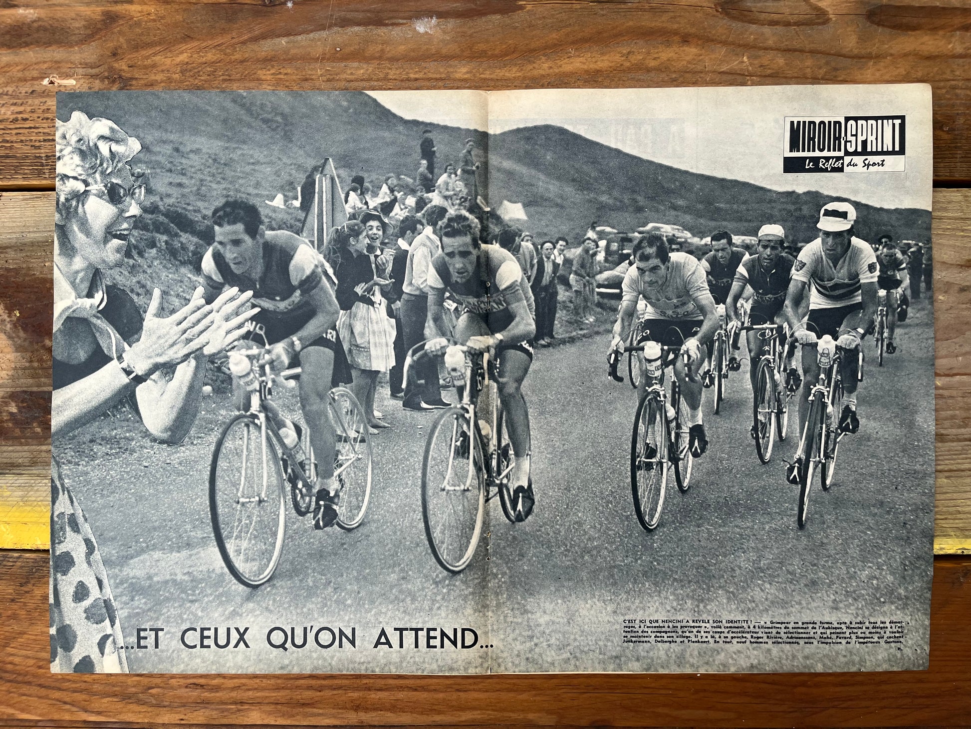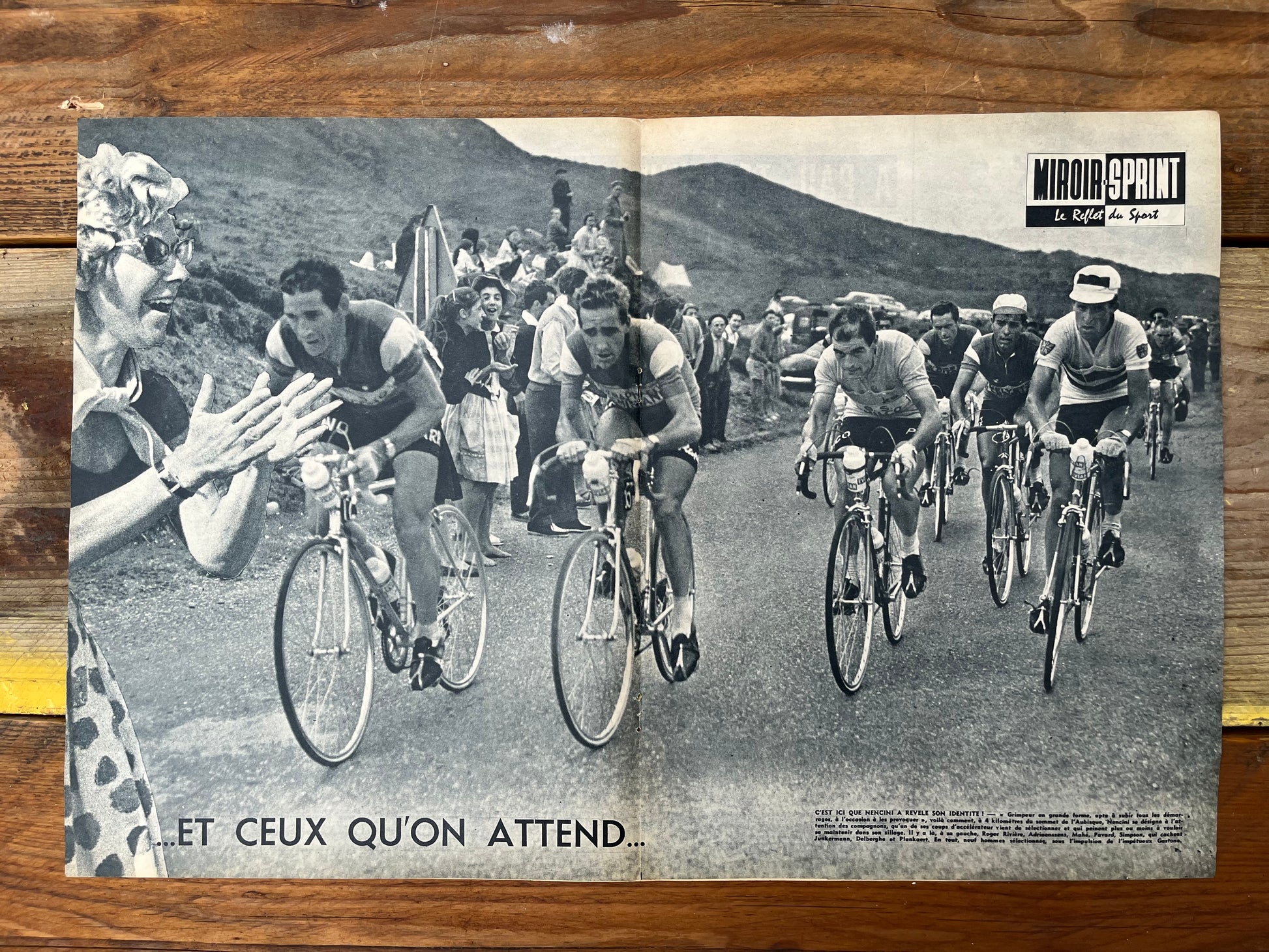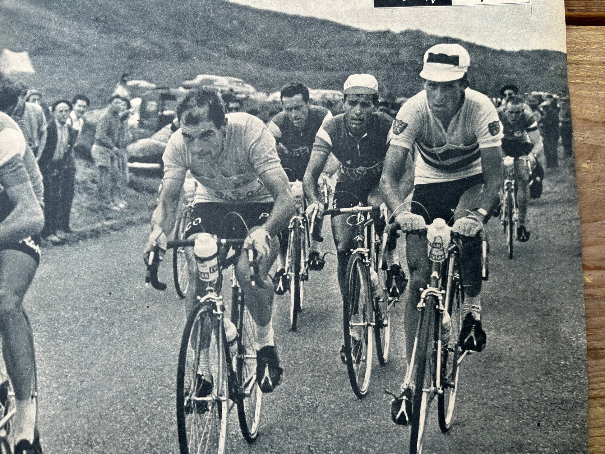 Vintage 1960 magazine print featuring Tom Simpson, Roger Rivière and Gaston Nencini as well as others at the summit of the Col d’Aubisque in the 1960 Tour de France.