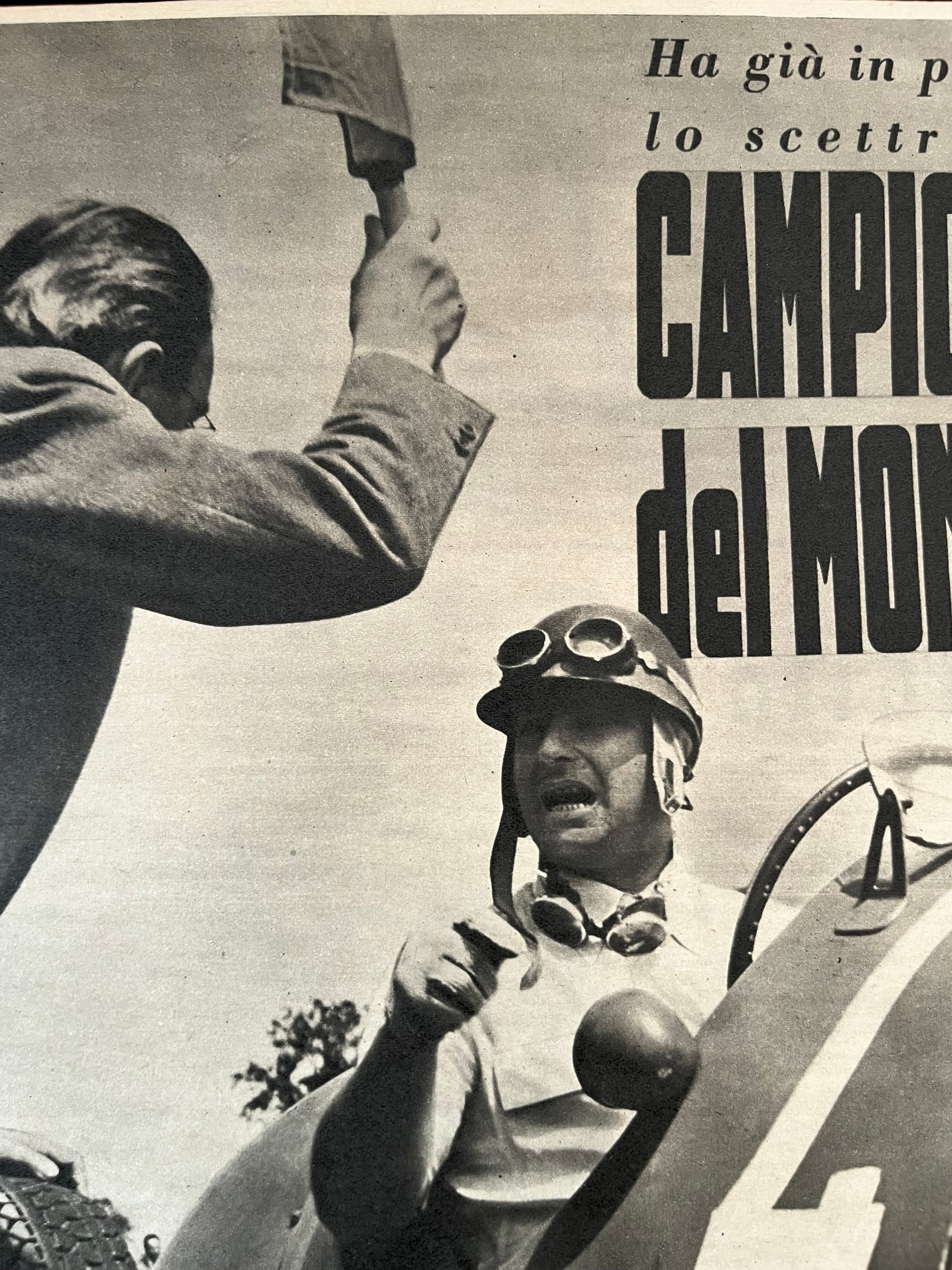 Original c1955 Italian magazine cover artwork showing Juan Manuel Fangio in his Ferrari race car.