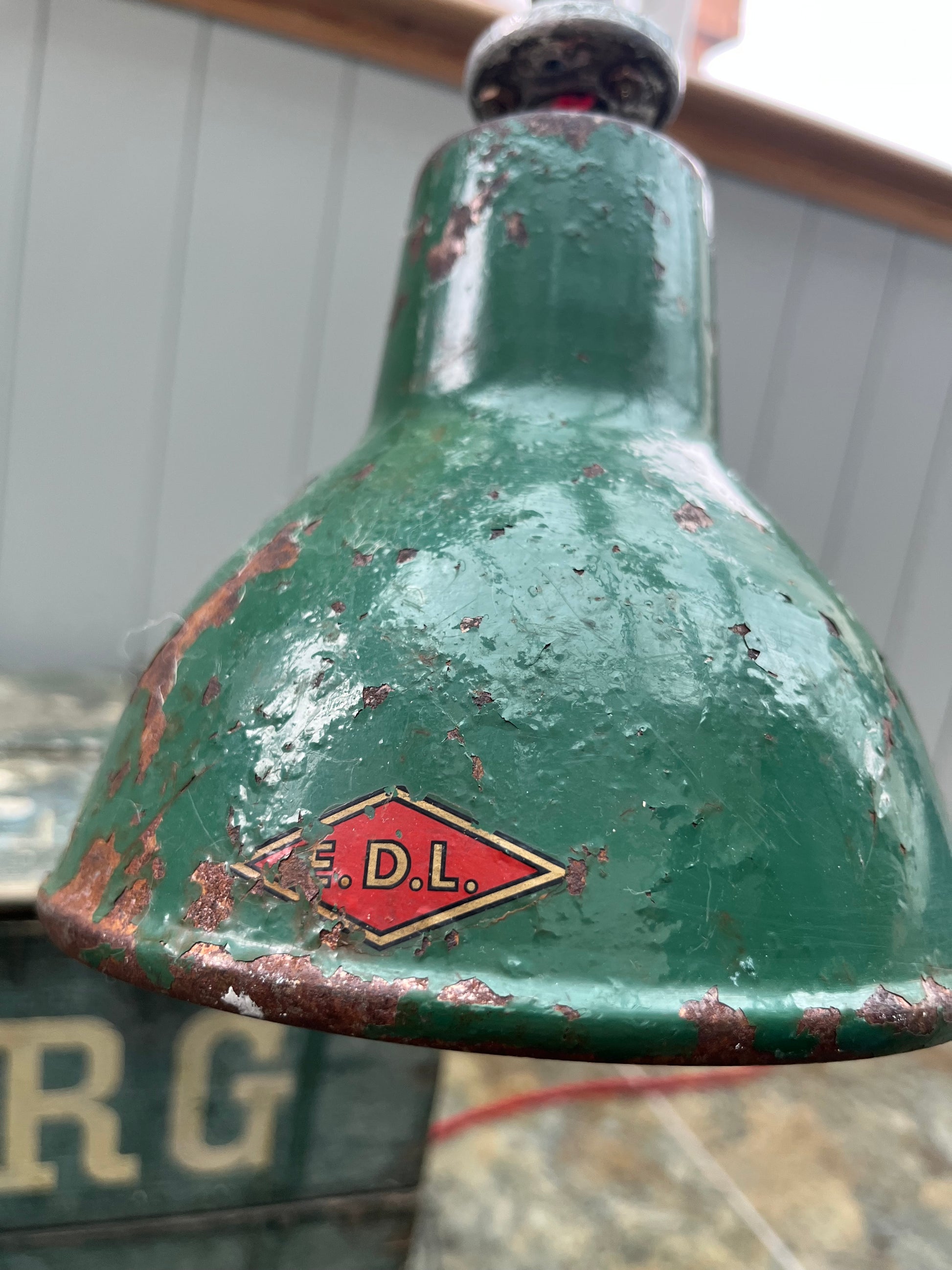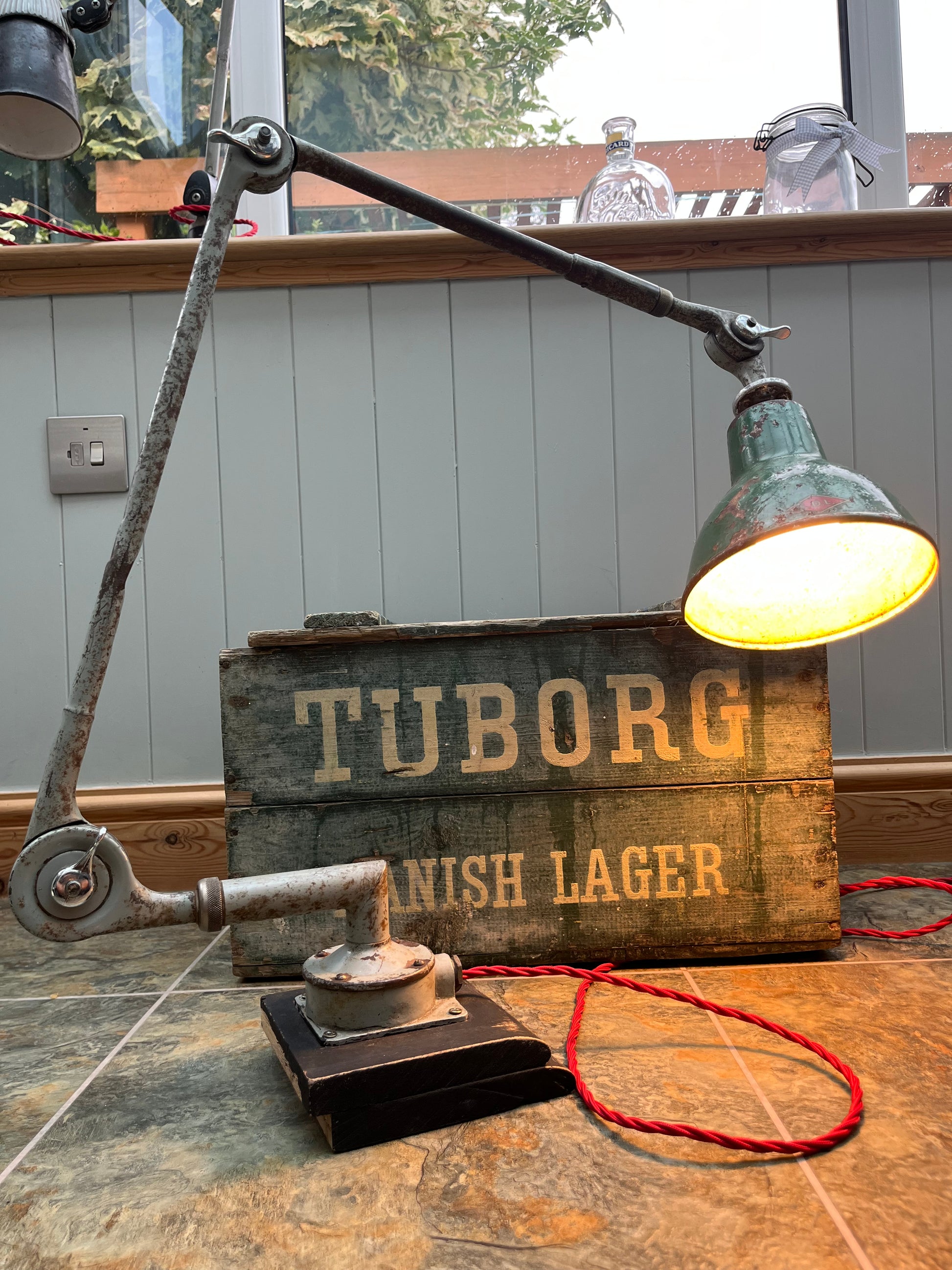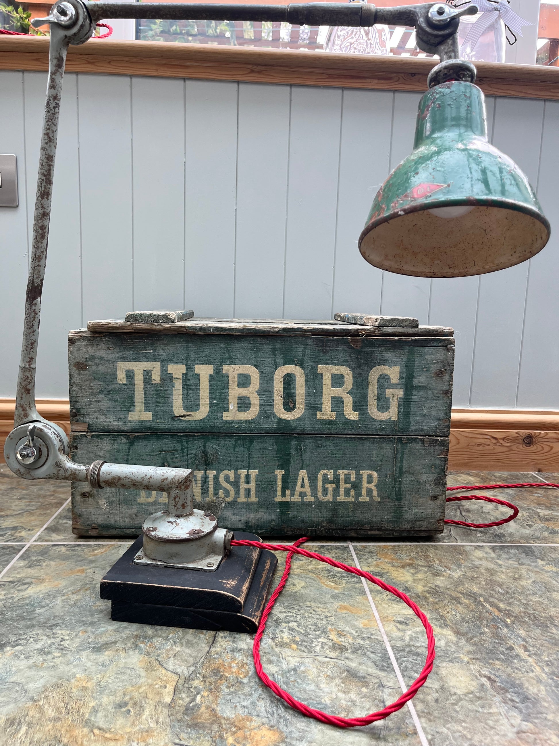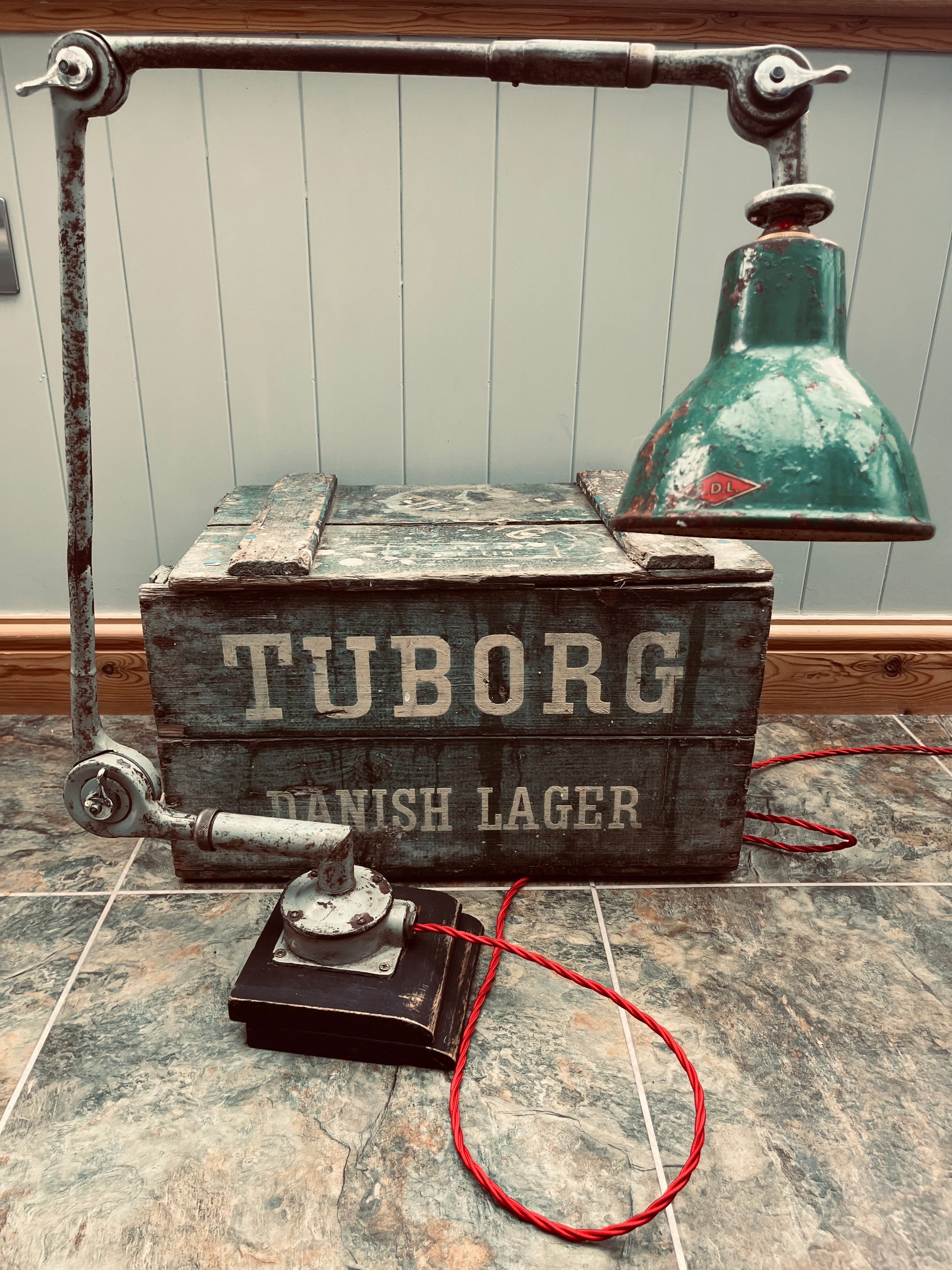Pale grey with patination and green metal shade fitted. Has been rewired with triple core red wiring and pat tested for safety and is ready to use.