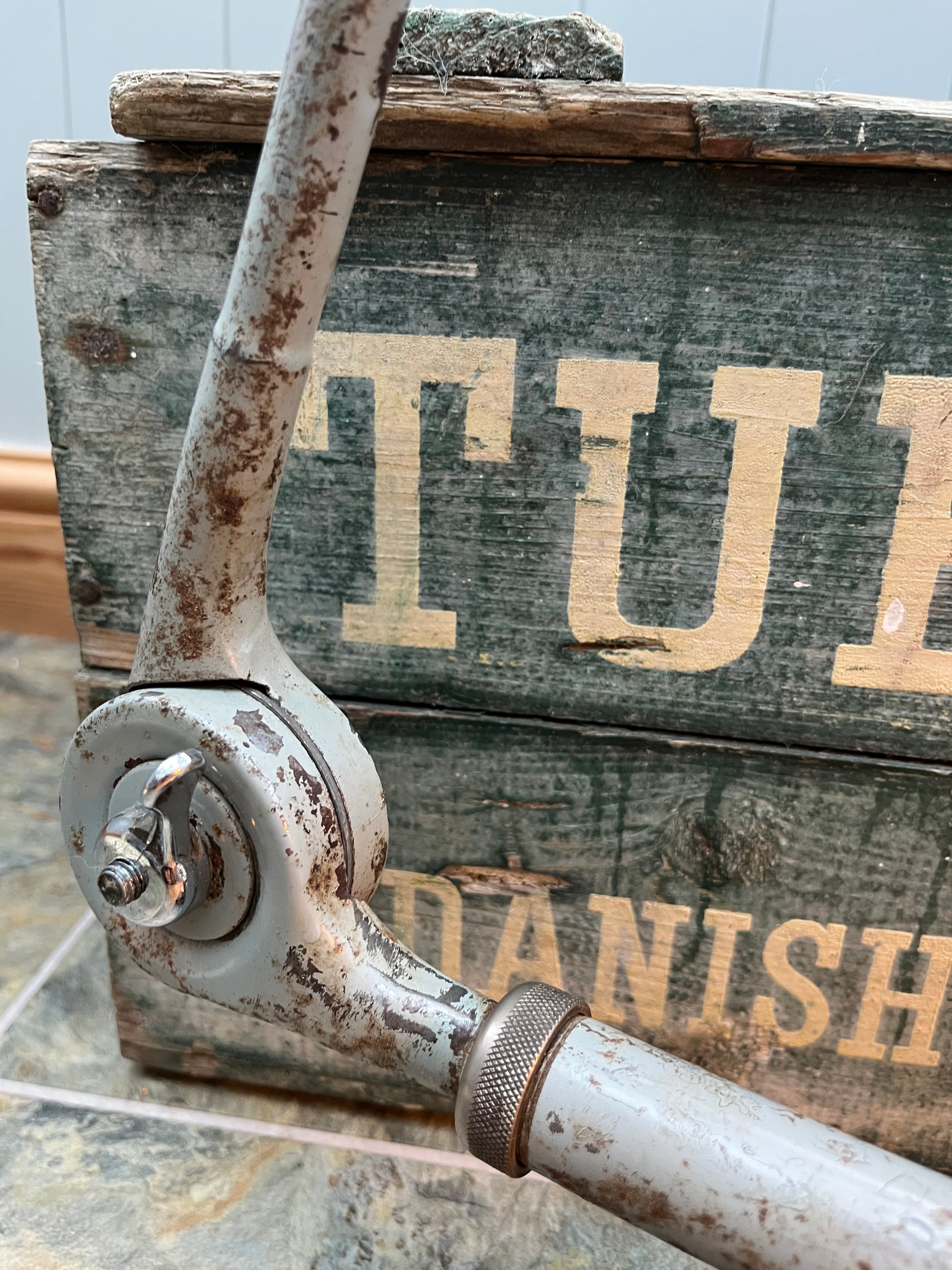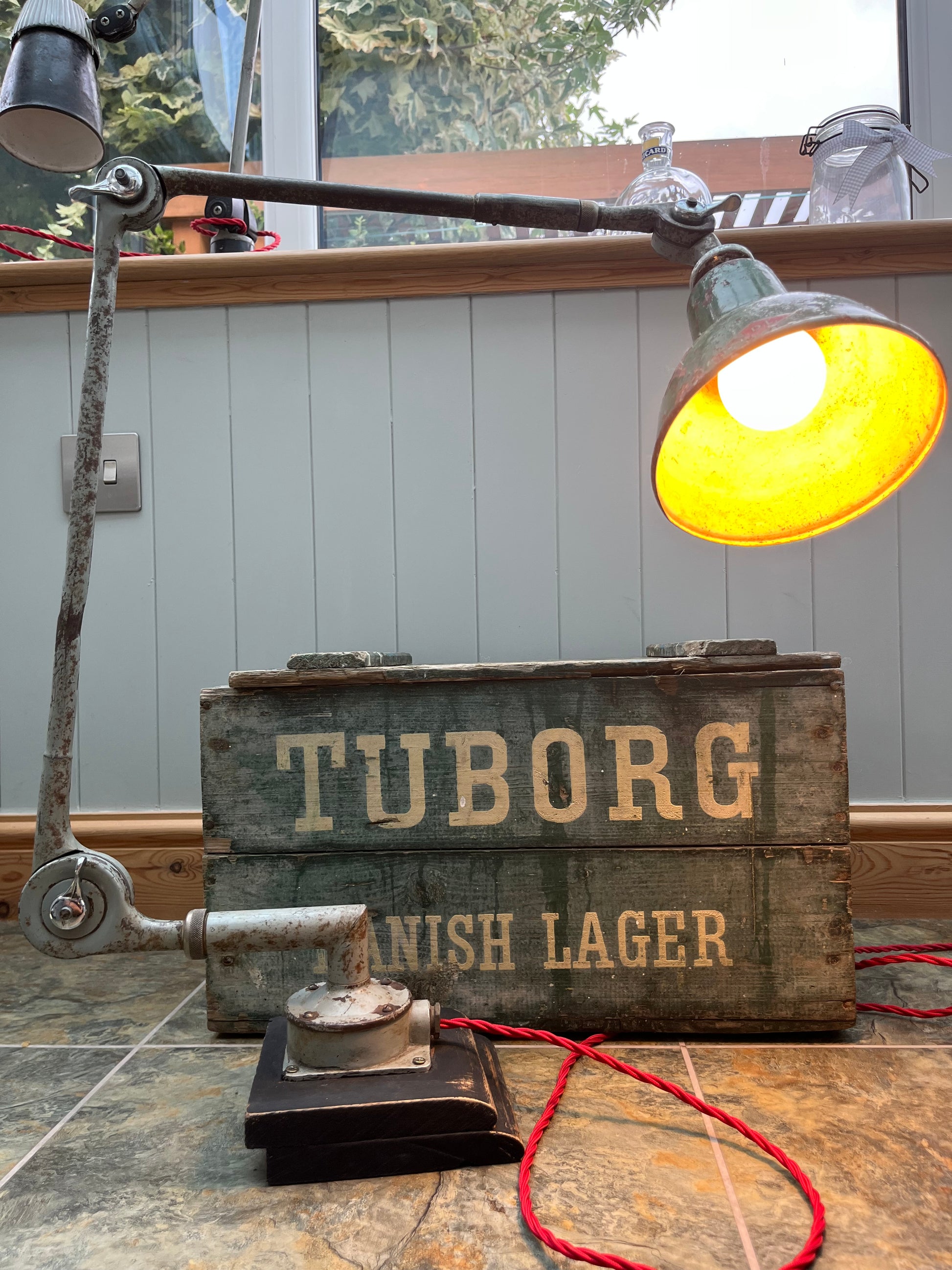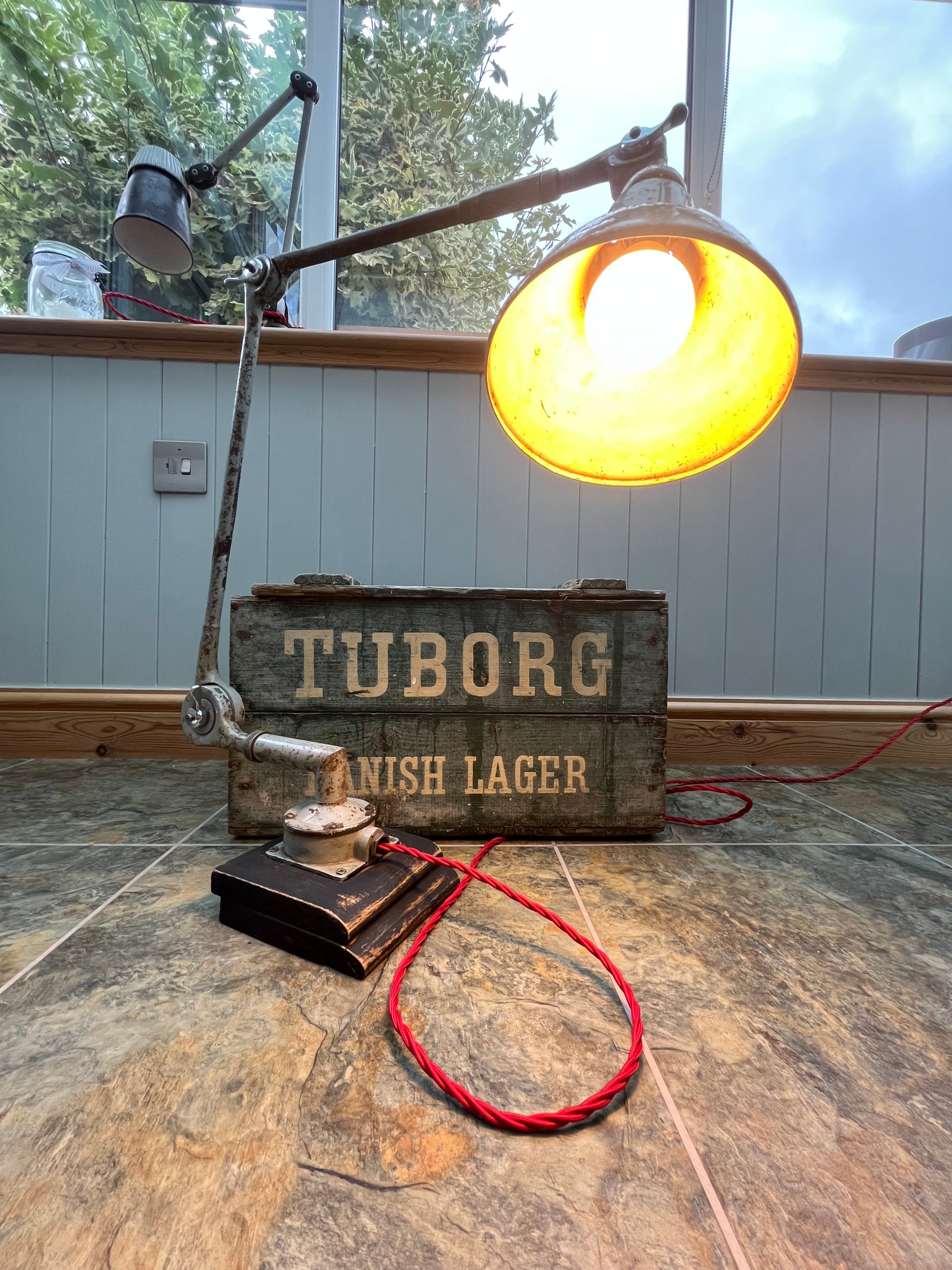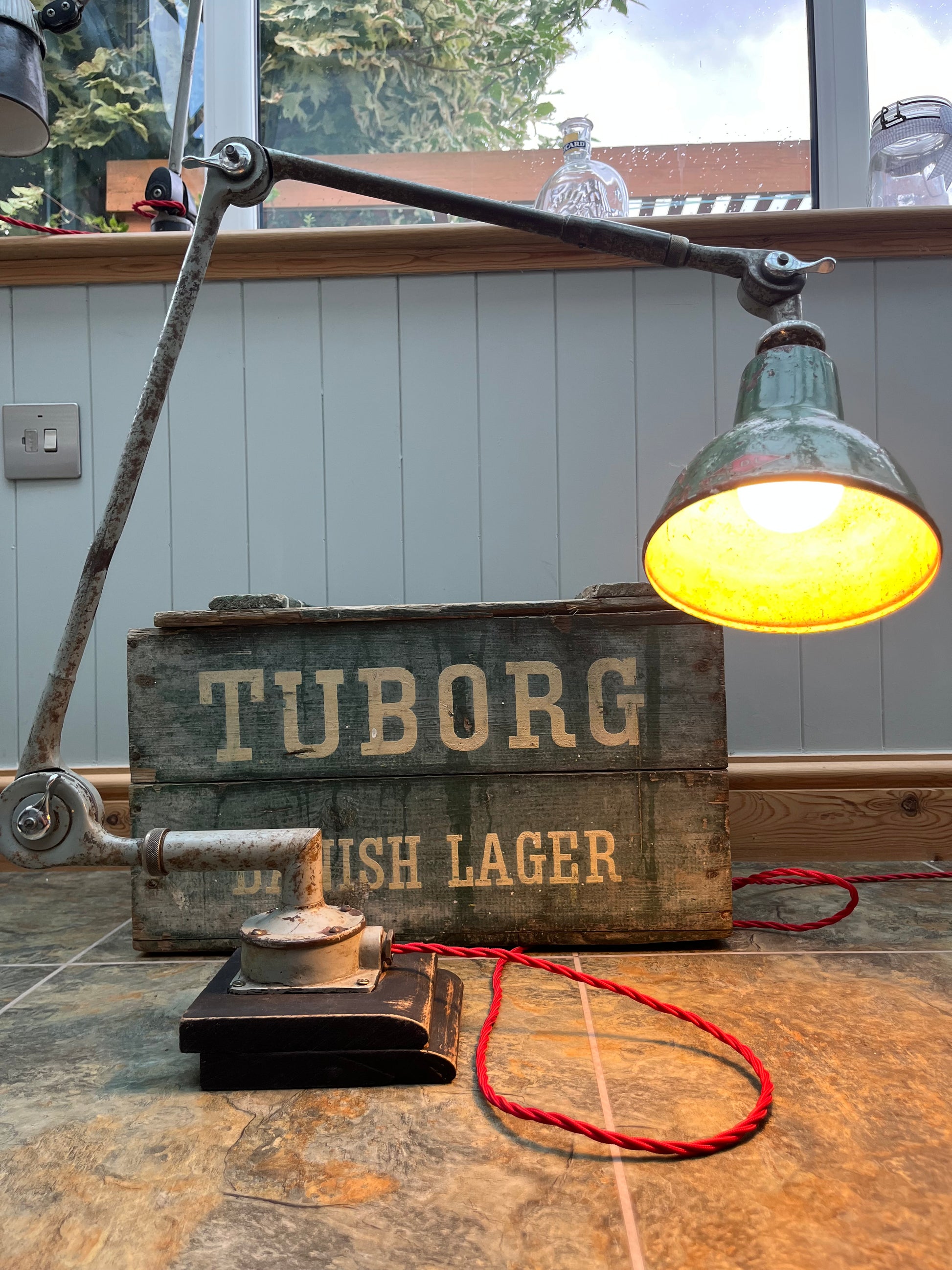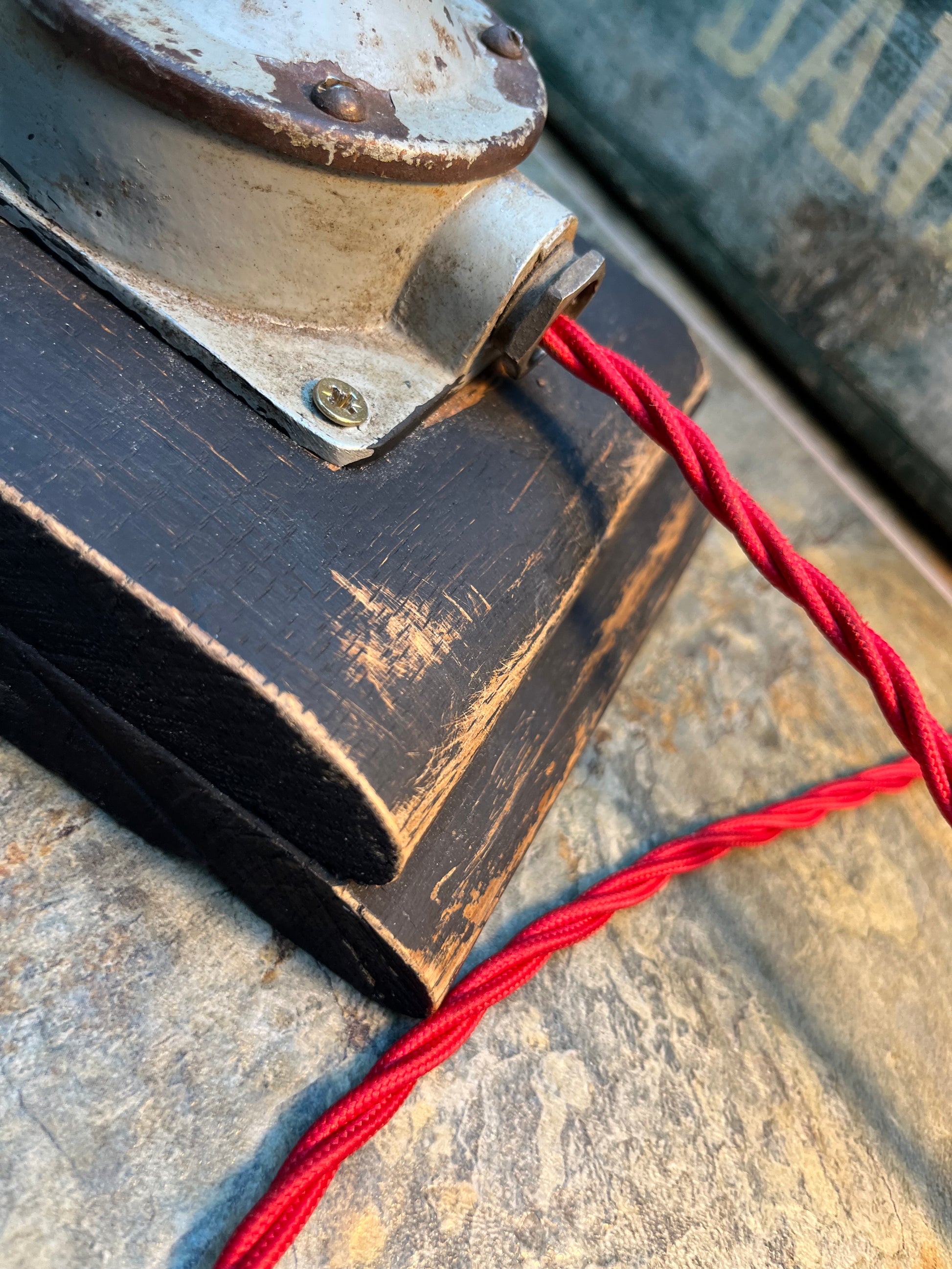 An antique Industrial design lamp originally fitted to factory equipment. Mounted in a custom made elm base.