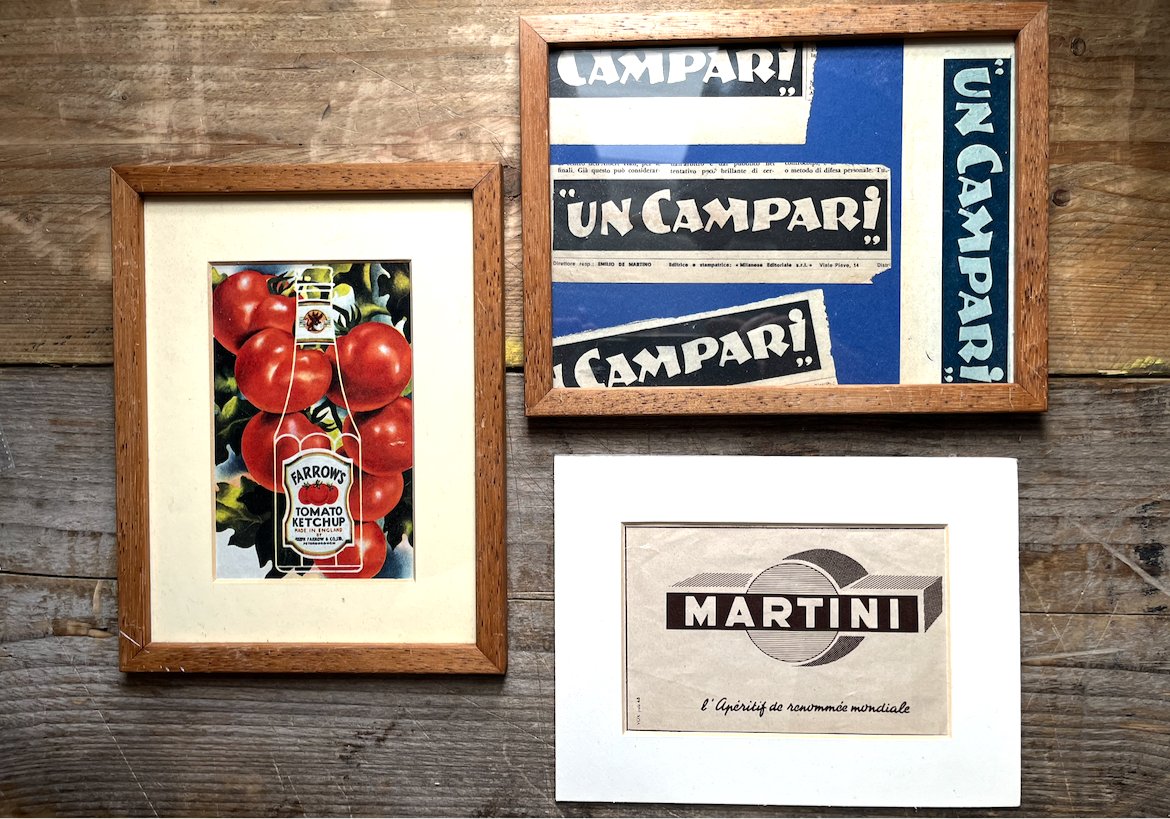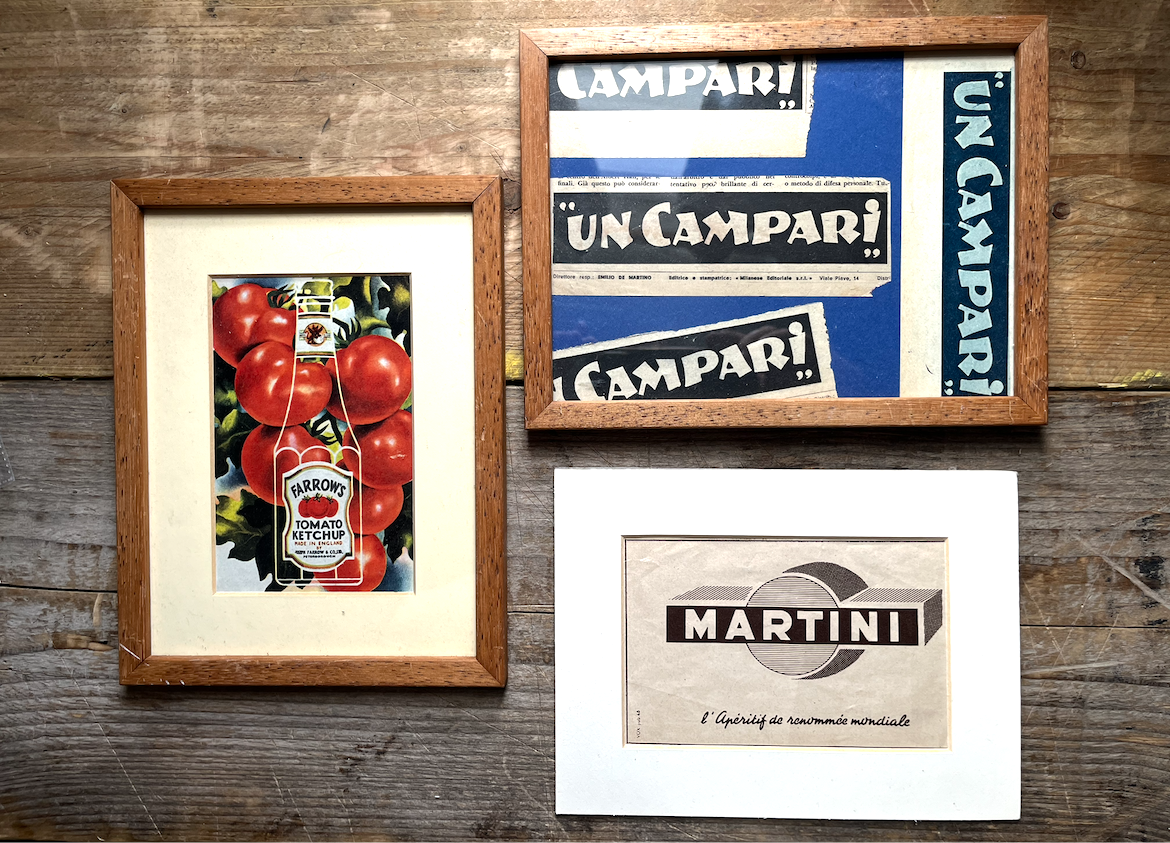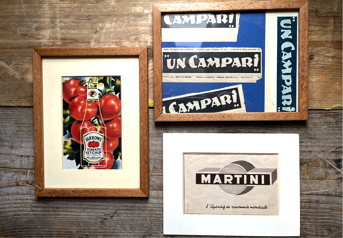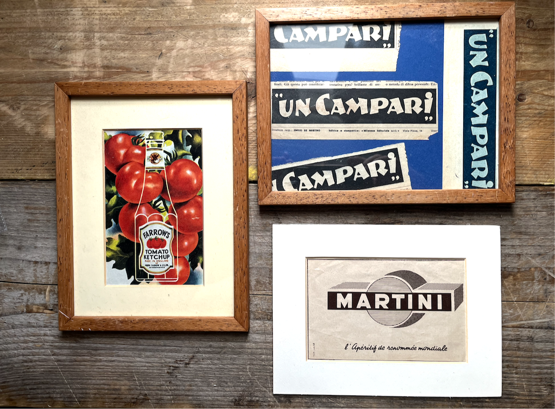 A cluster of three vintage c1950s Martini Campari and Farrows Ketchup artwork from original 1950s print advertisements. Two are framed, one is card mounted.