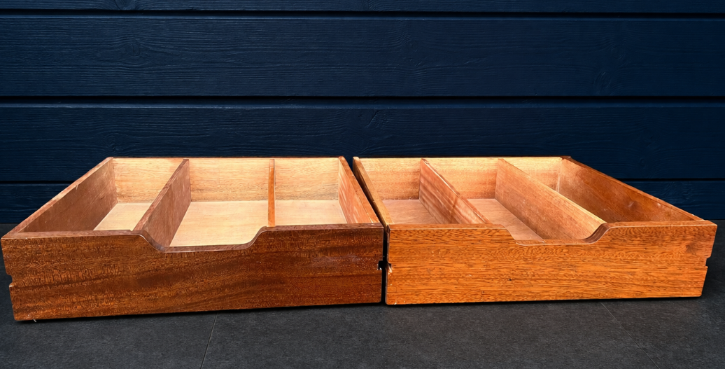 Pair of high quality Iroko dovetailed drawers originally part of a 1960s Enham school cabinet. Beautiful design with a “dipped” finger pull.