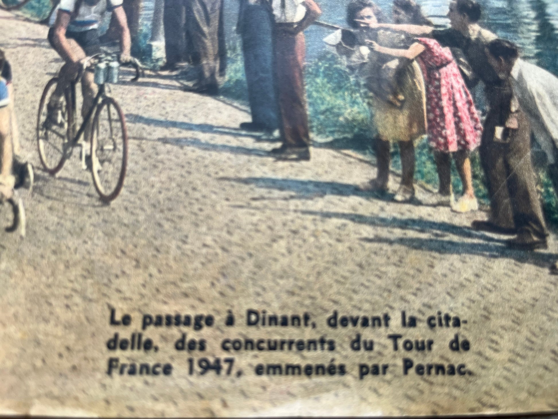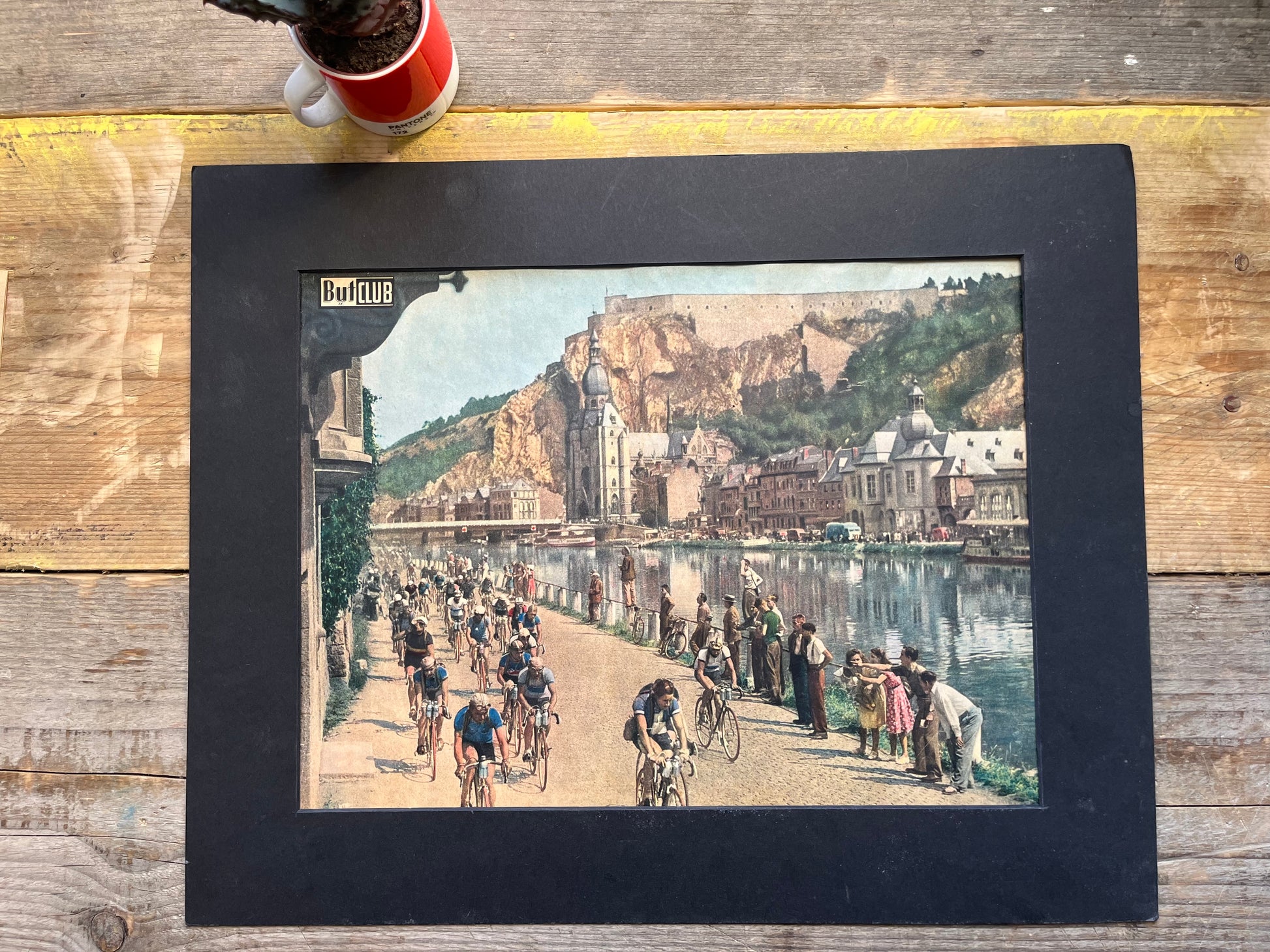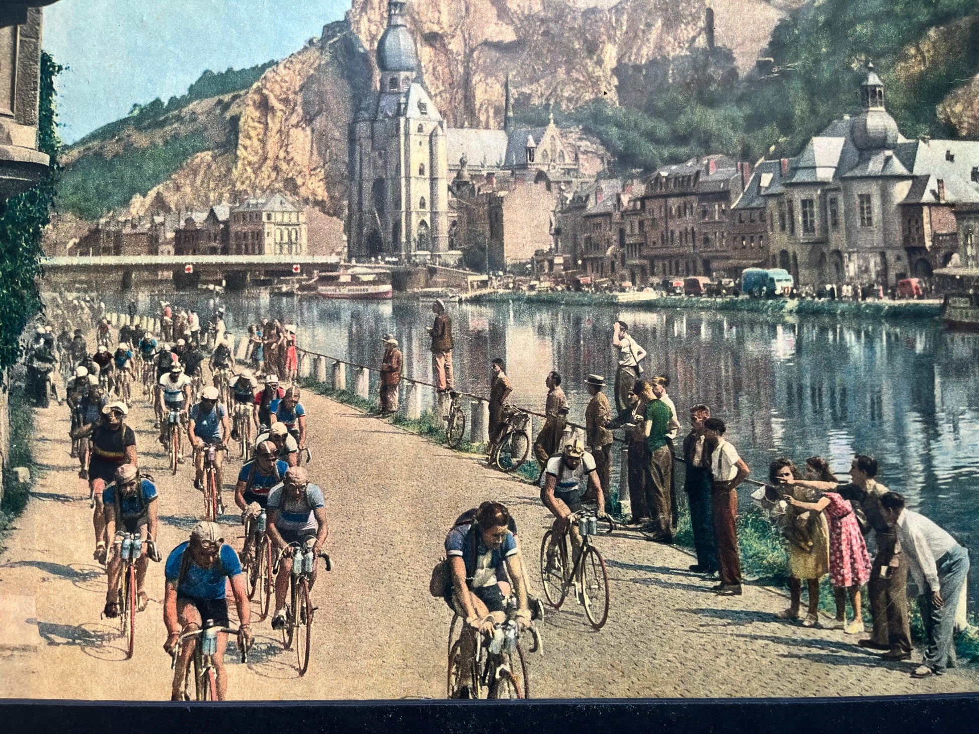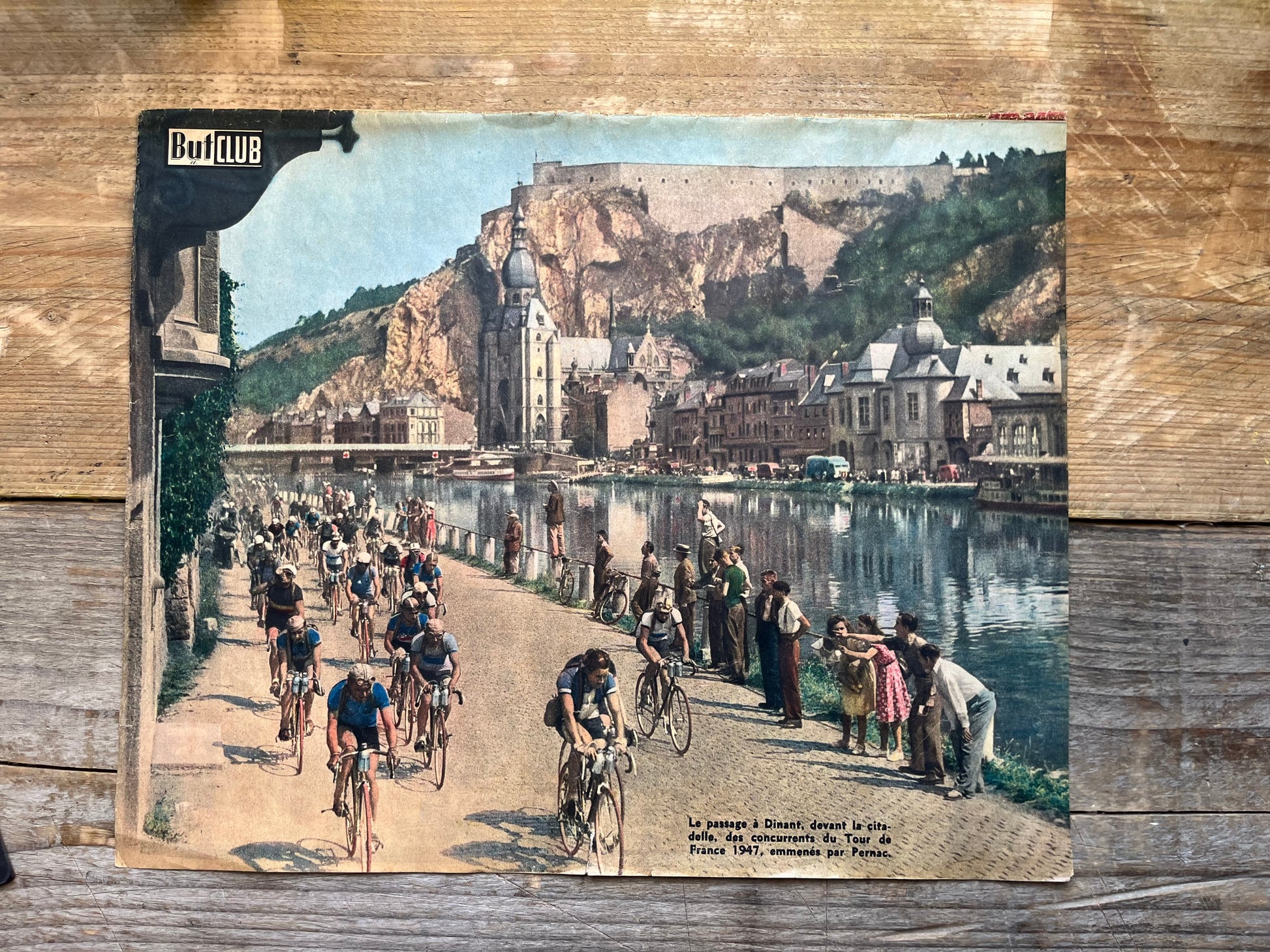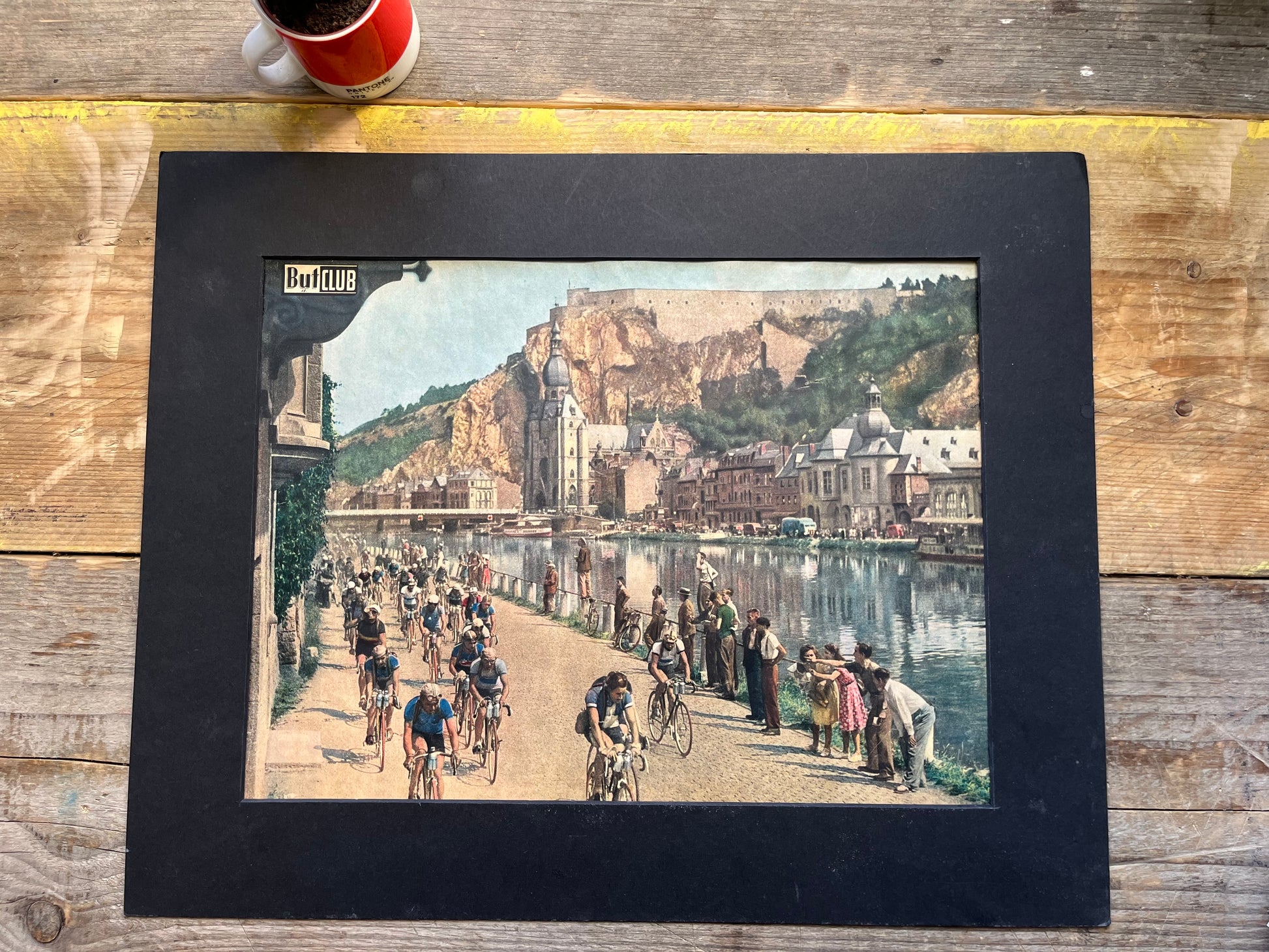 A great looking piece of historical artwork for the lounge or study… Very rare original 1947 cycling magazine print featuring the peloton riding along the quayside in Pernac.