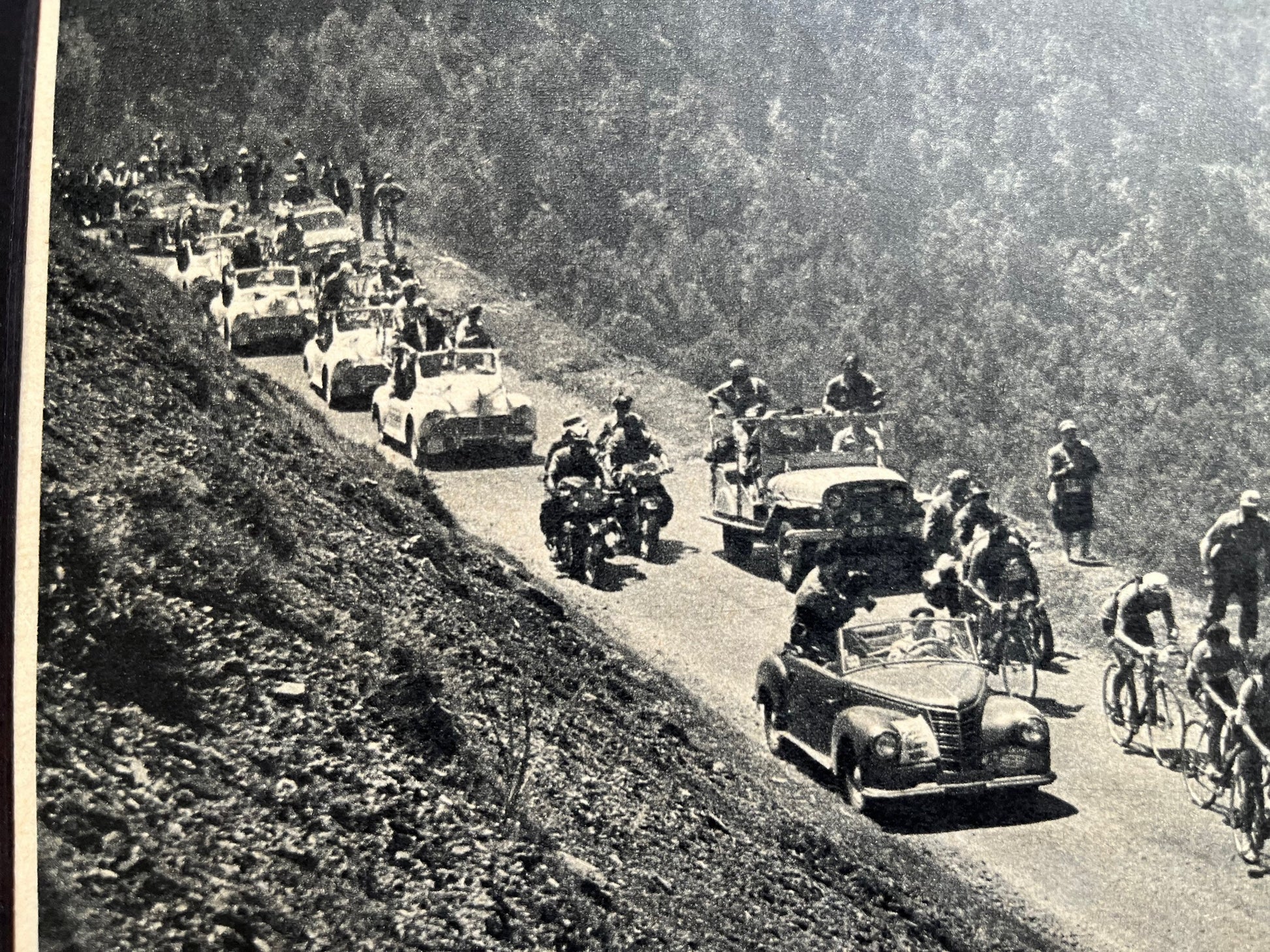 Iconic and very rare original 1950s French cycling magazine print showing the peloton made up of Louison Bobet, Raphael Geminiani and Gilbert Bauvin to name a few.