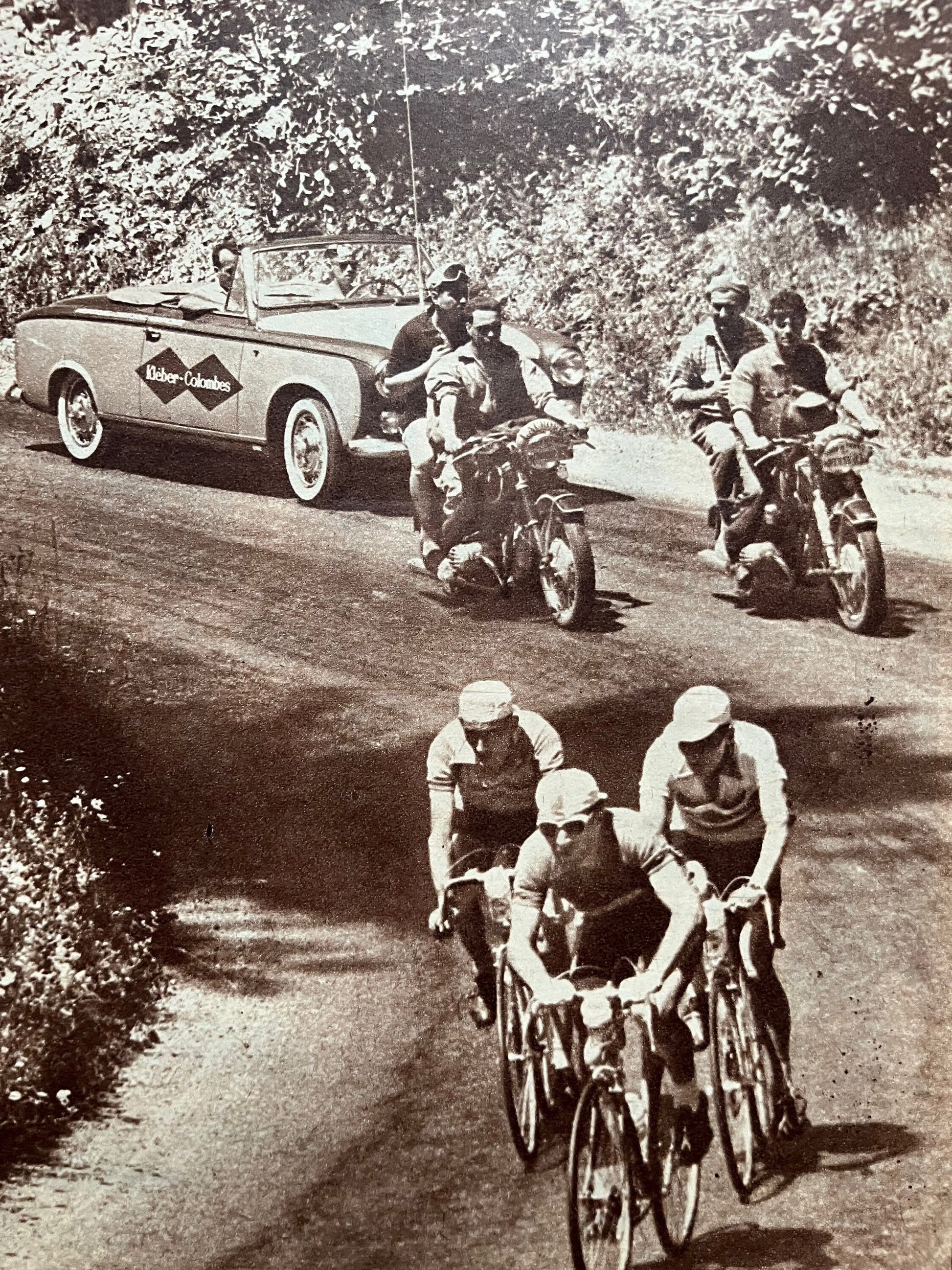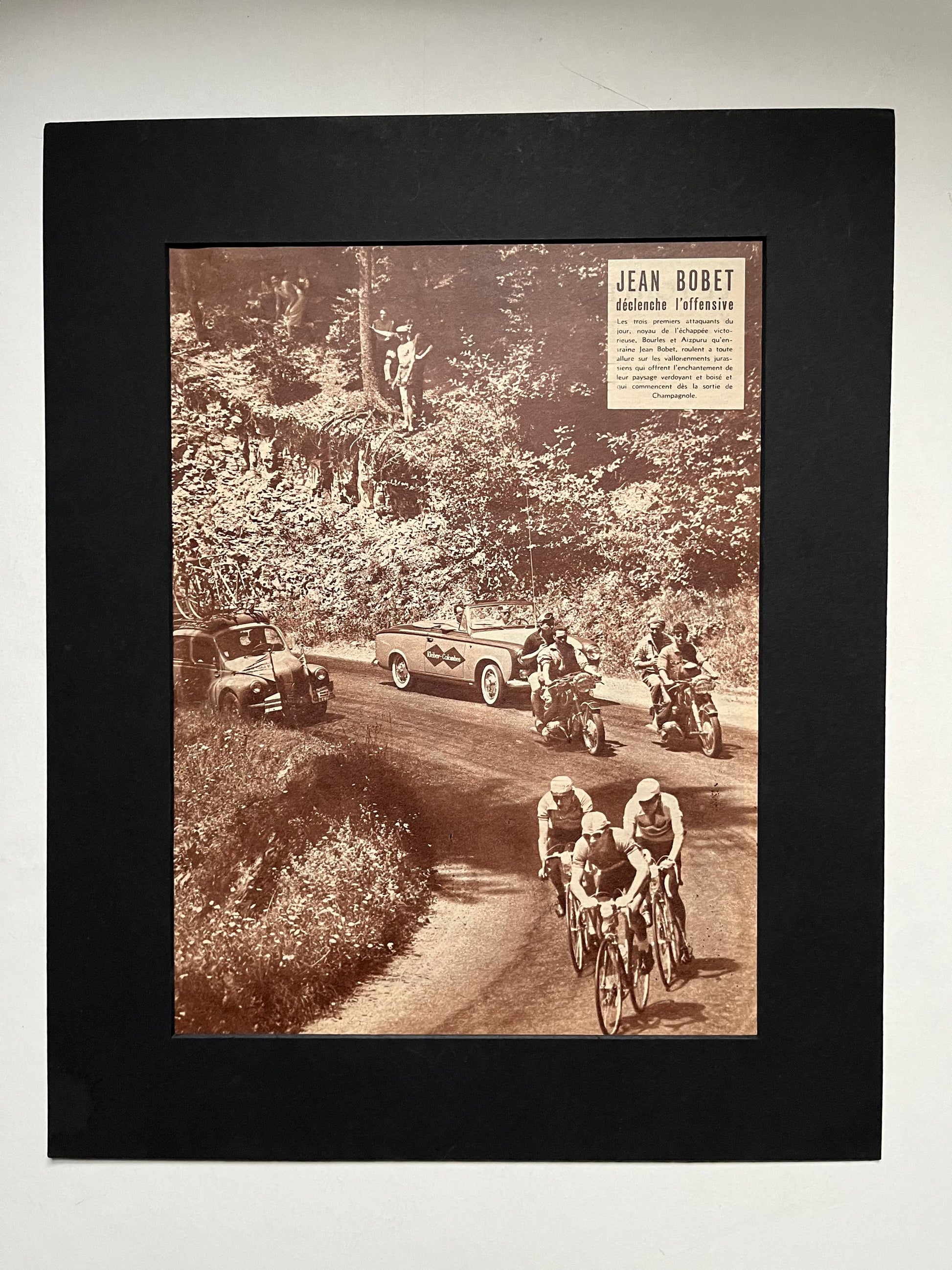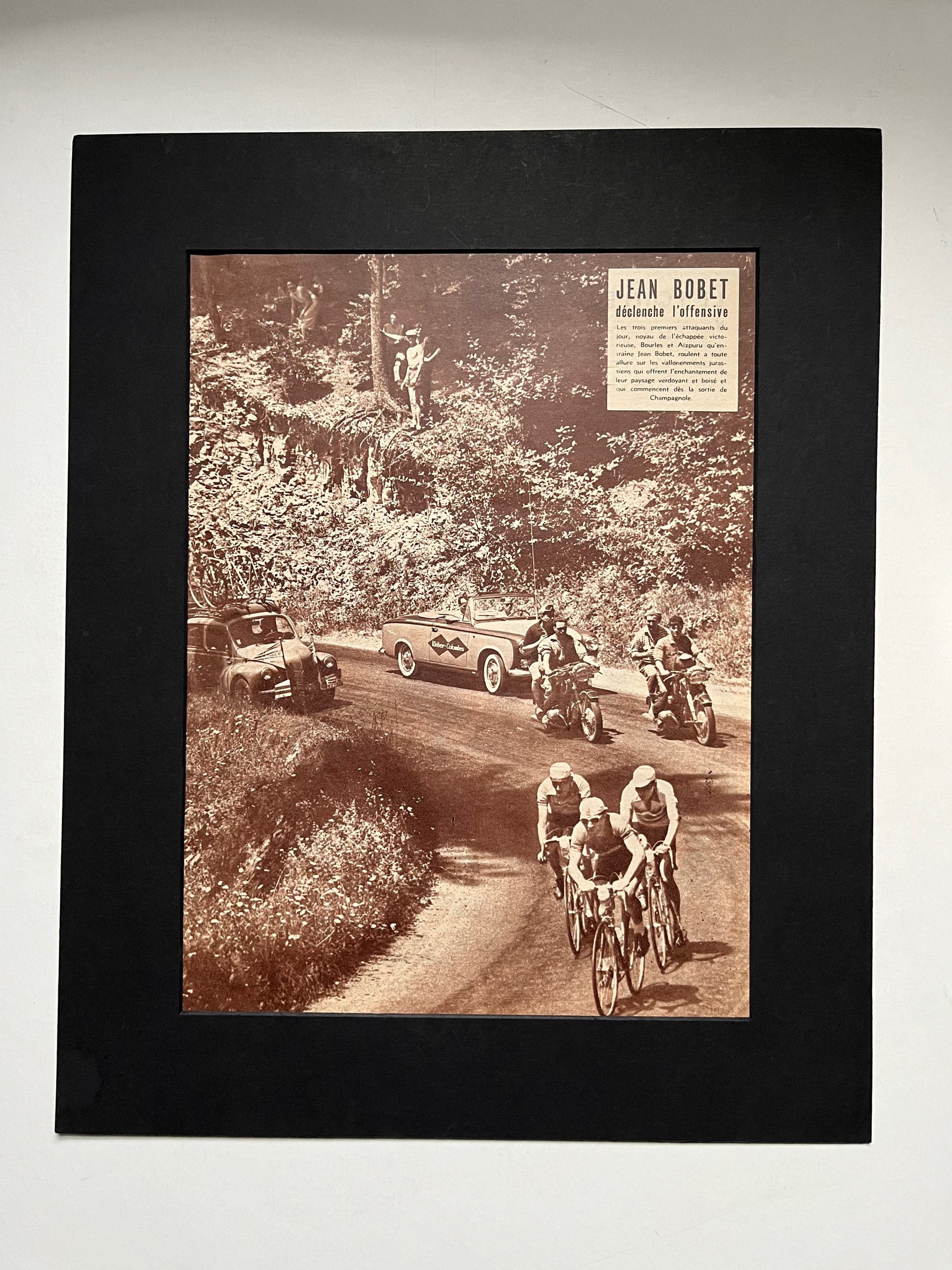 Iconic and very rare Original 1953 French cycling magazine print featuring Jean Bobet in the peloton followed by some beautiful now classic race support vehicles.