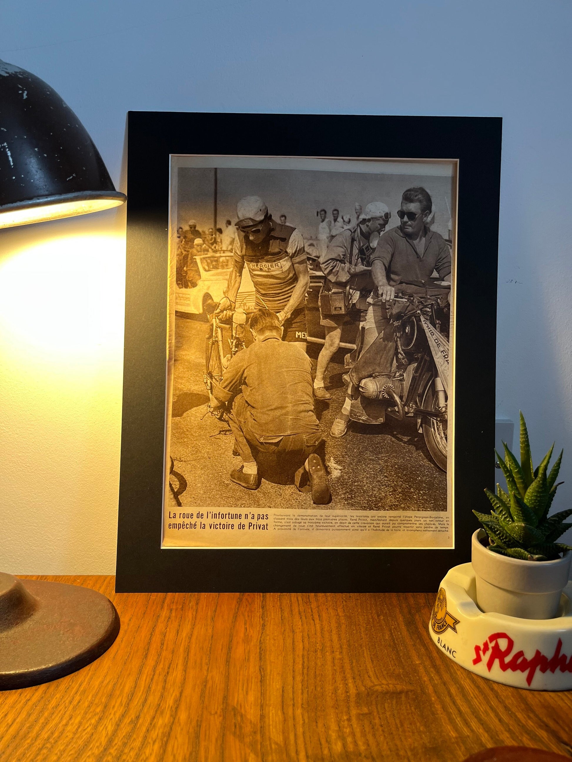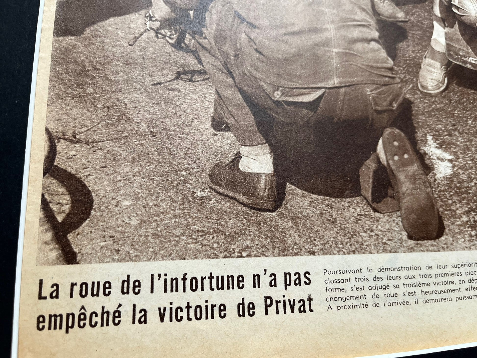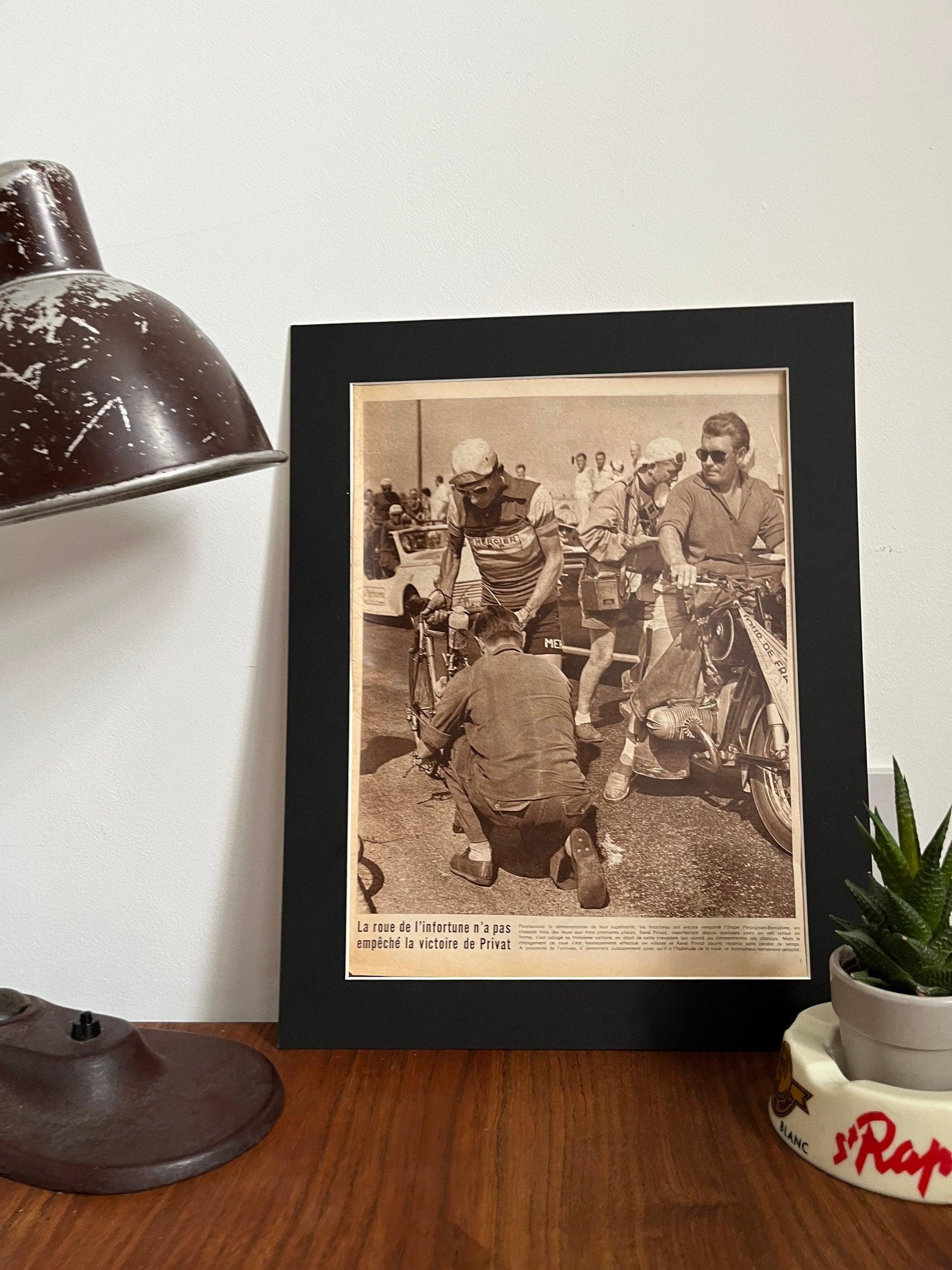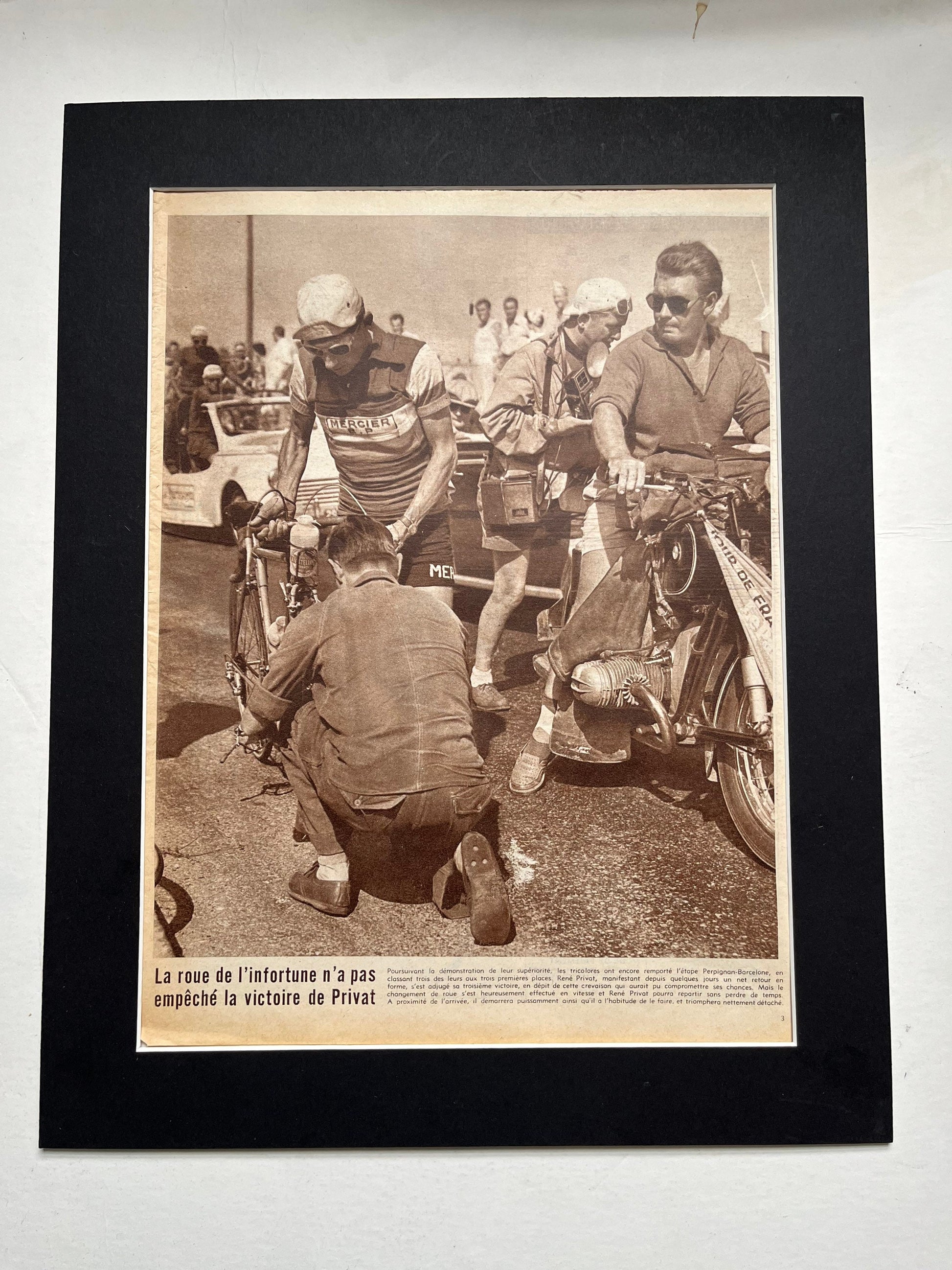 Iconic and very rare Original 1957 French cycling magazine print showing Mercier rider Rene Privat off the bike. He won three stages during this race. An impactful image!