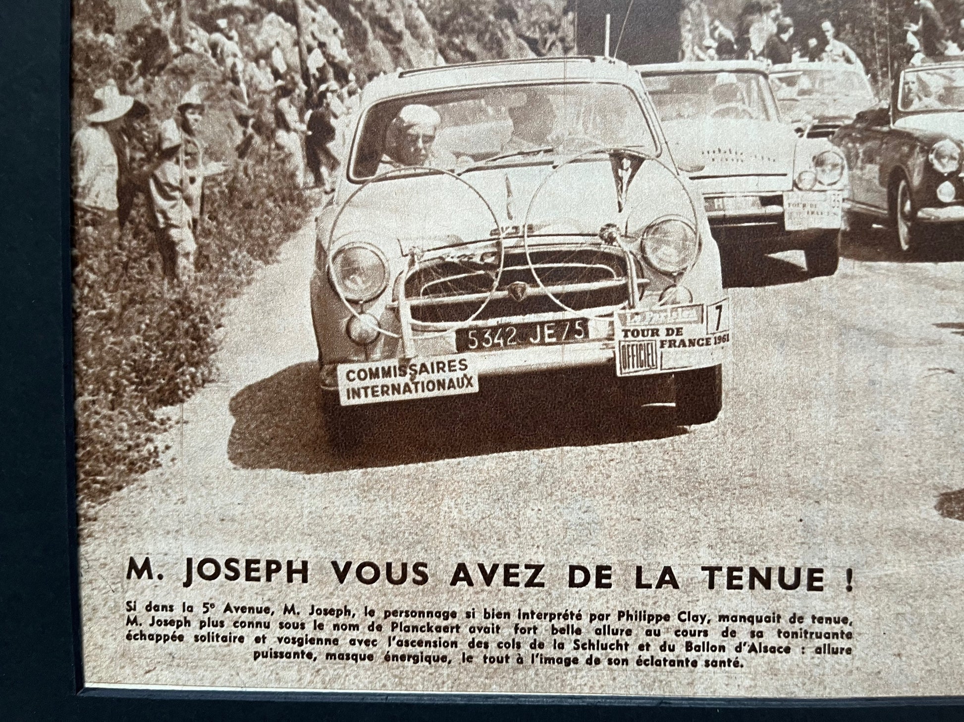 Iconic and very rare Original c1956 French cycling magazine print featuring a rider ahead of a Peugeot support car. An impactful image..