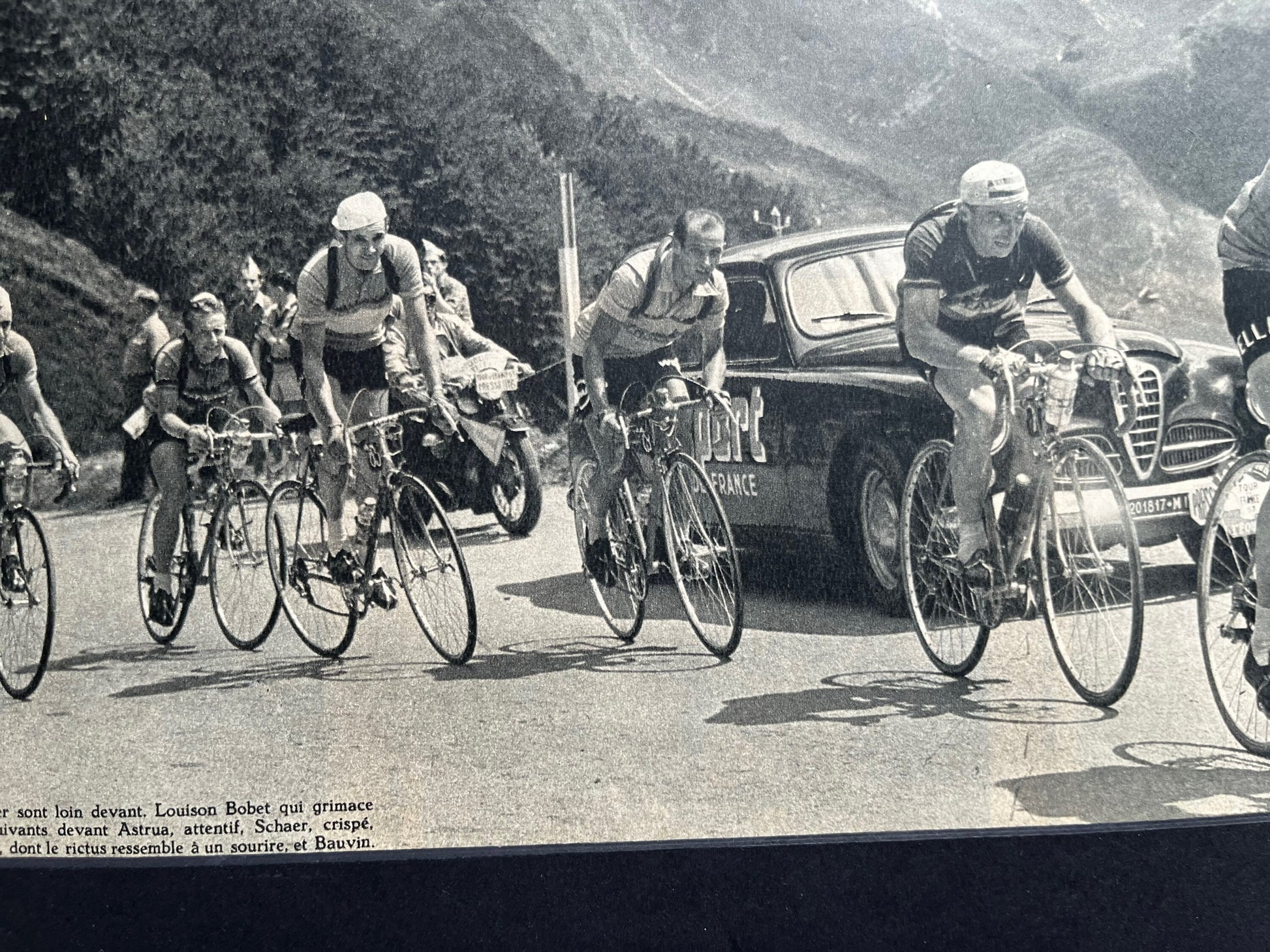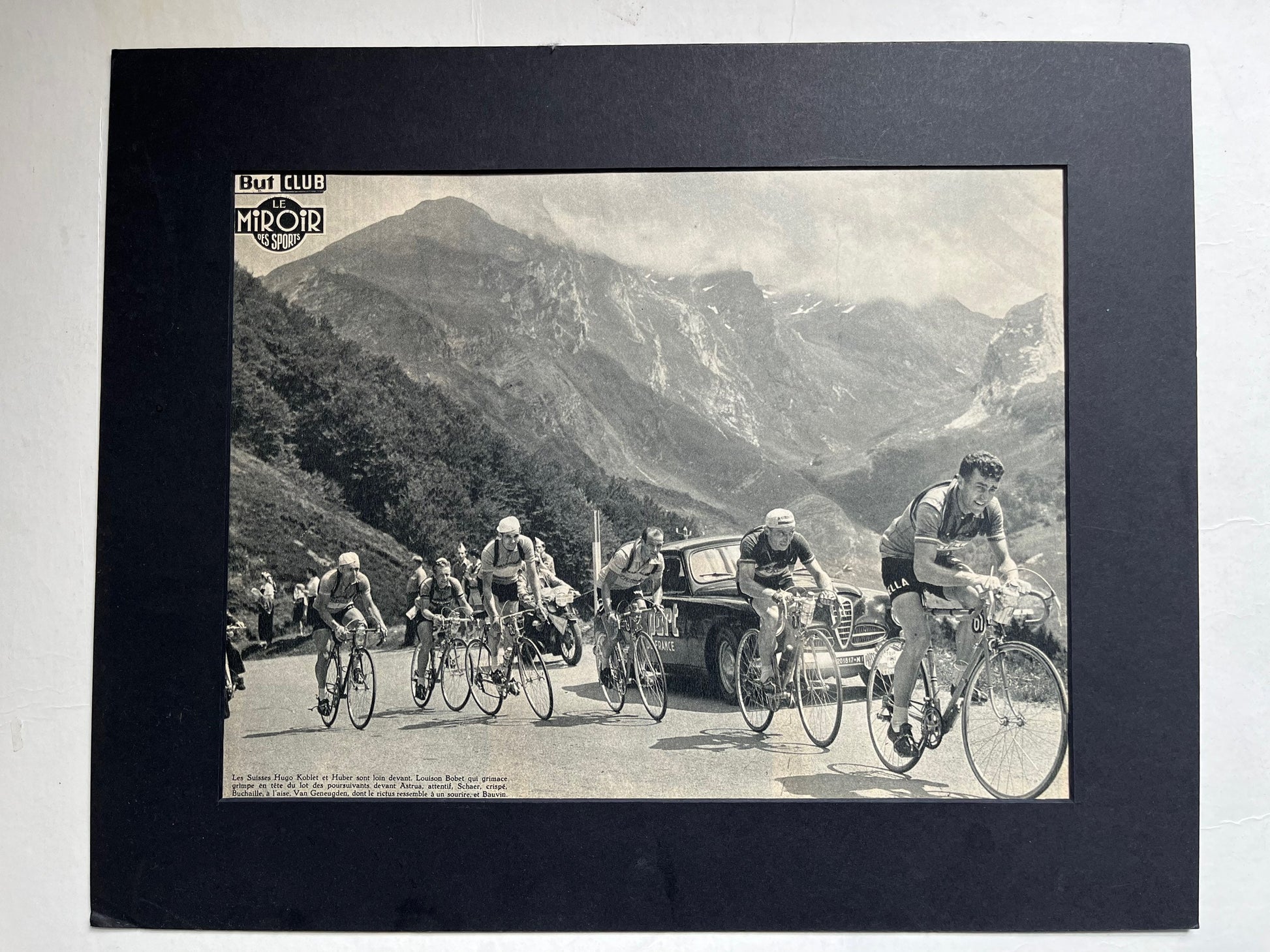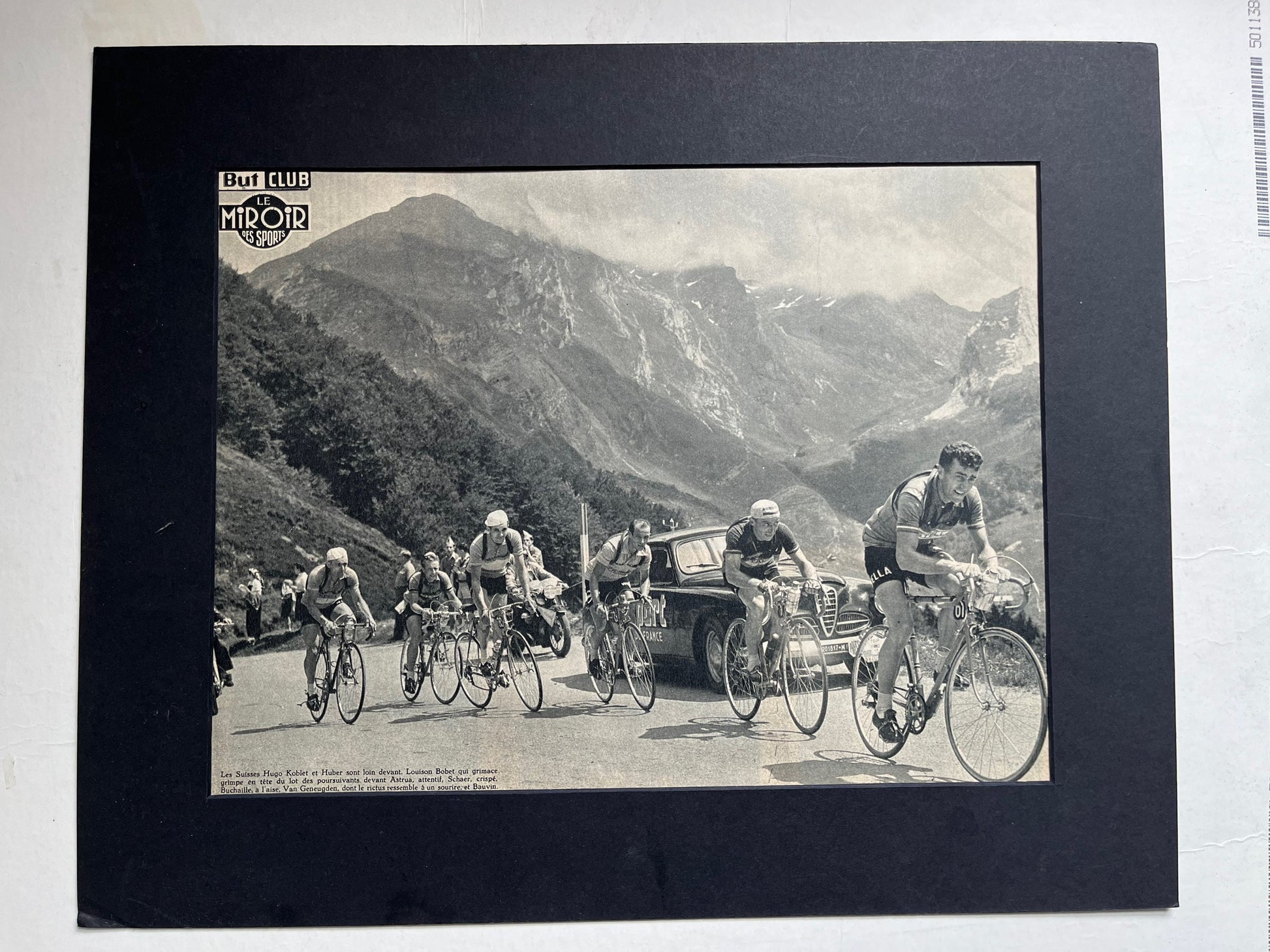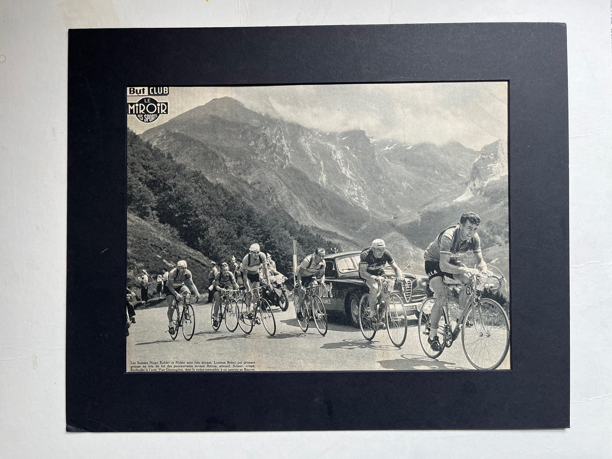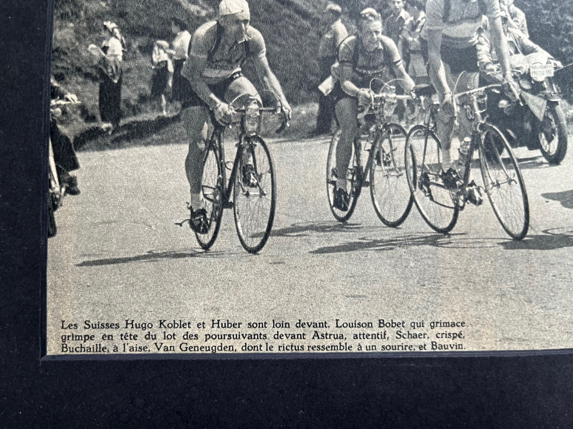 Iconic and very rare Original 1951 French cycling magazine print featuring Louison Bobet and Hugo Koblet leading the peloton through a mountain stage. A very impactful image..