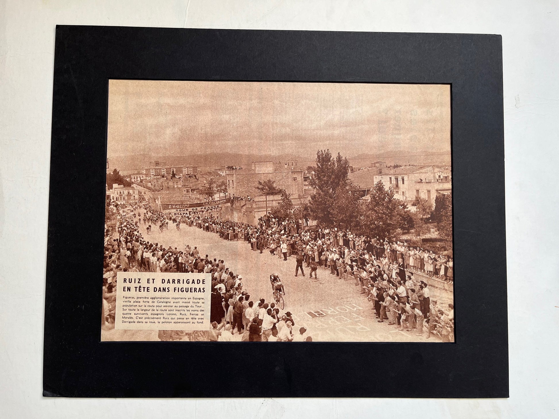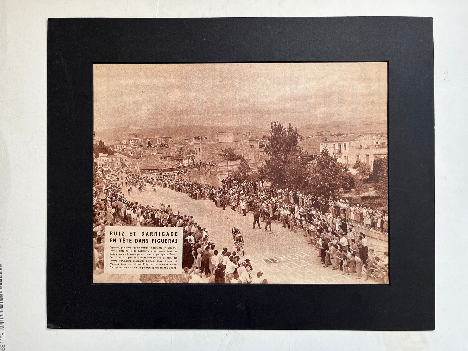 Iconic and very rare Original 1951 French cycling magazine print featuring Andre Darrigade battling four Spanish riders at during a stage of the Tour de France. A very impactful image..