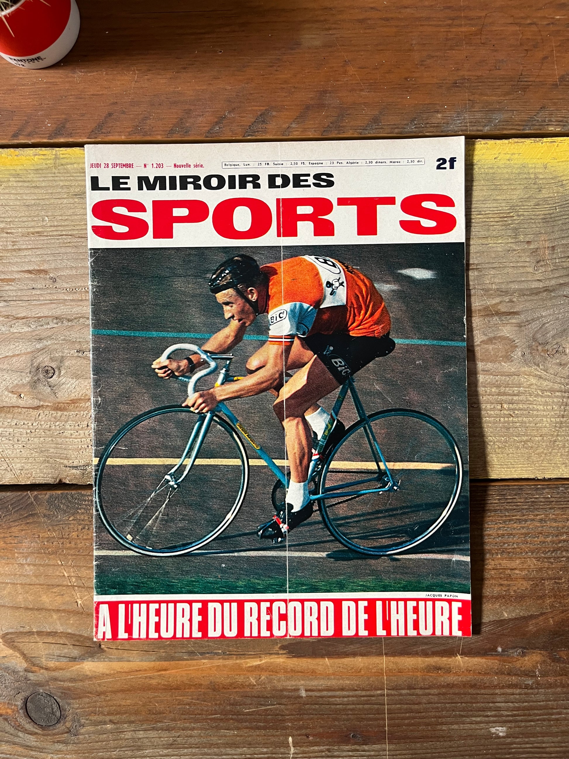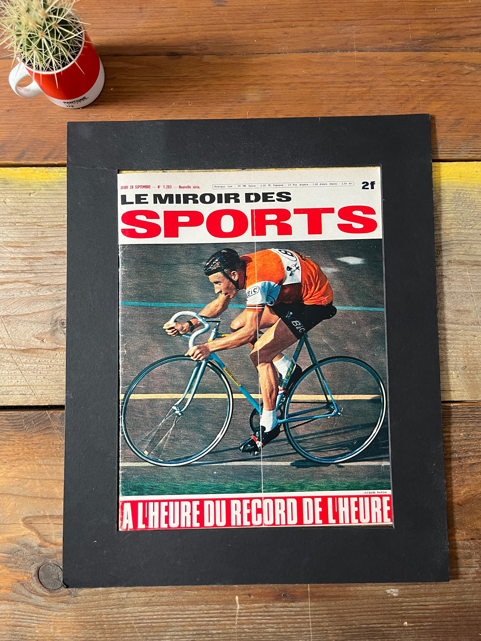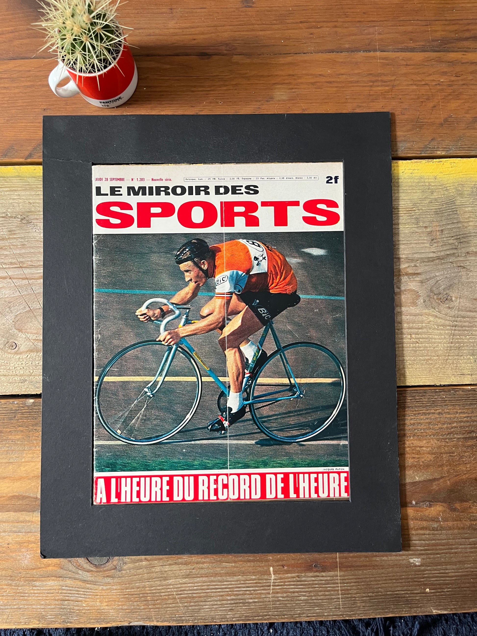 Iconic and very rare 1967 magazine print featuring Jacques Anquetil completing the hour record in 1967, achieving 47.493 kilometers in a hour but this distance was never officially recognized as Anquetil refused to rage a drugs test.