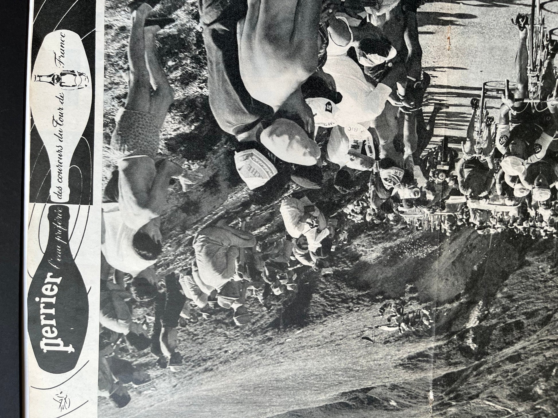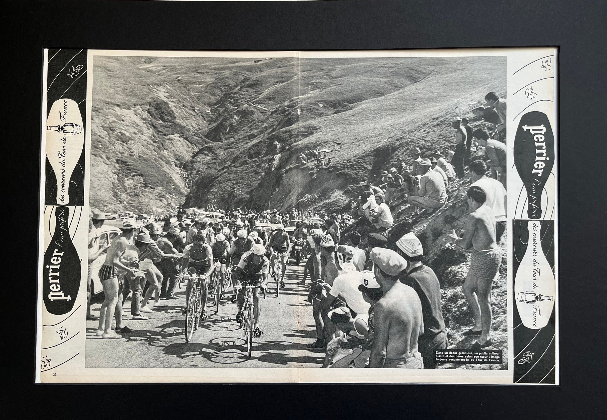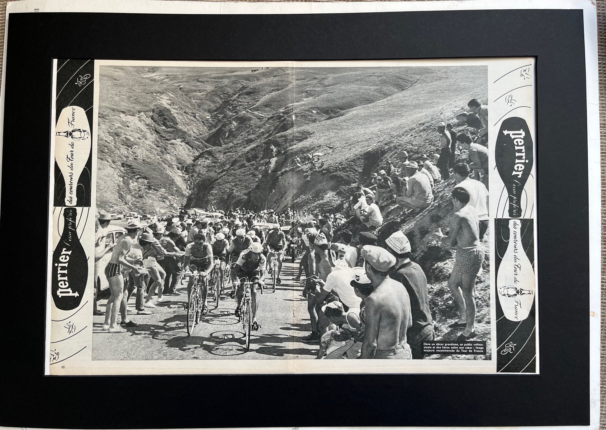 Iconic and very rare Original 1960s Tour de France magazine print featuring riders during an alpine stage of the tour. Sponsored by Perrier.