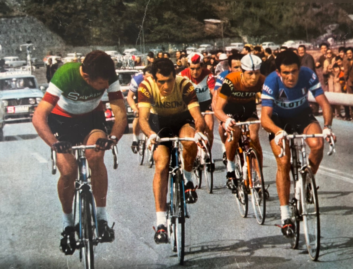 Vintage cycling print from around 1970. Felice Gimondi is on the left of the peloton.