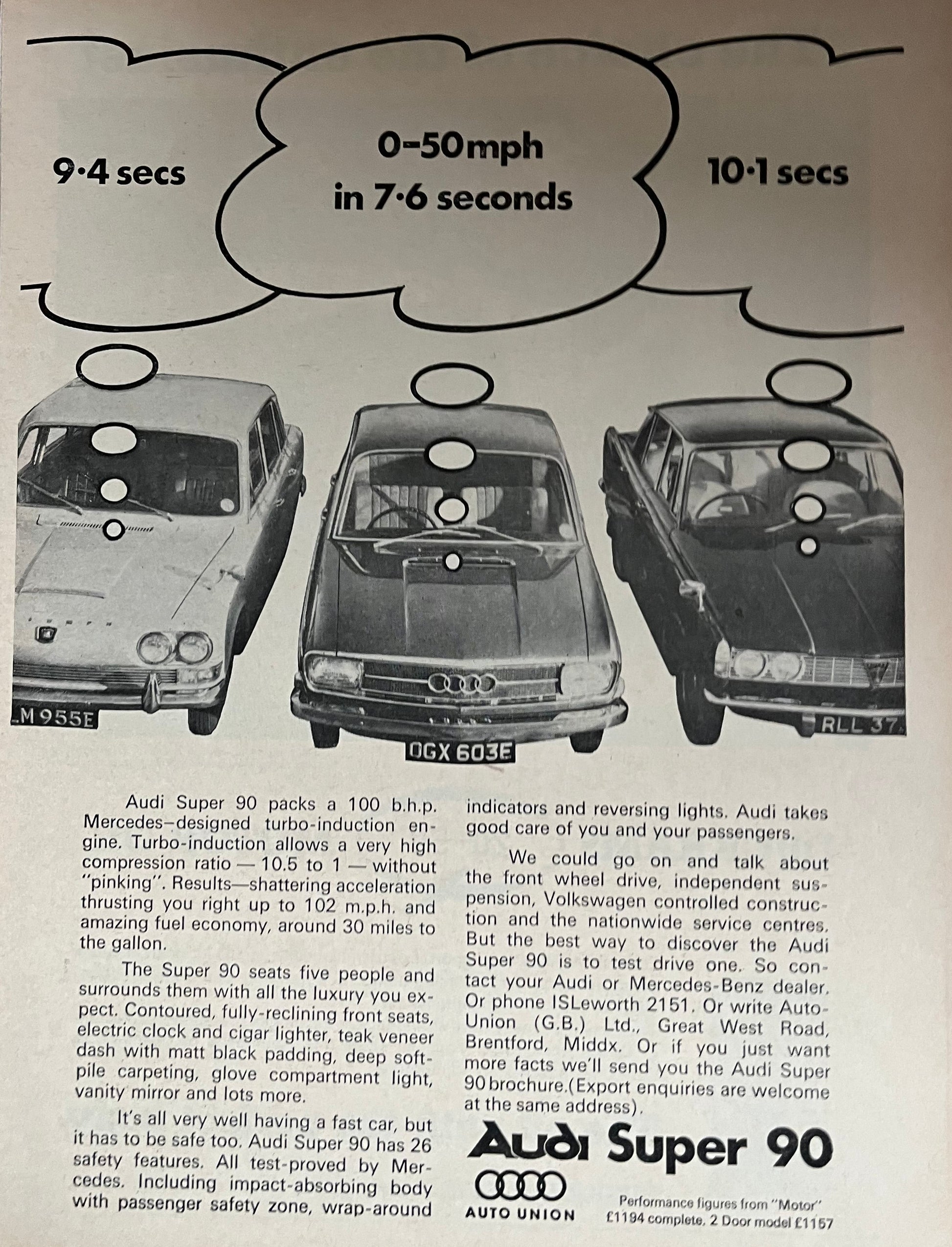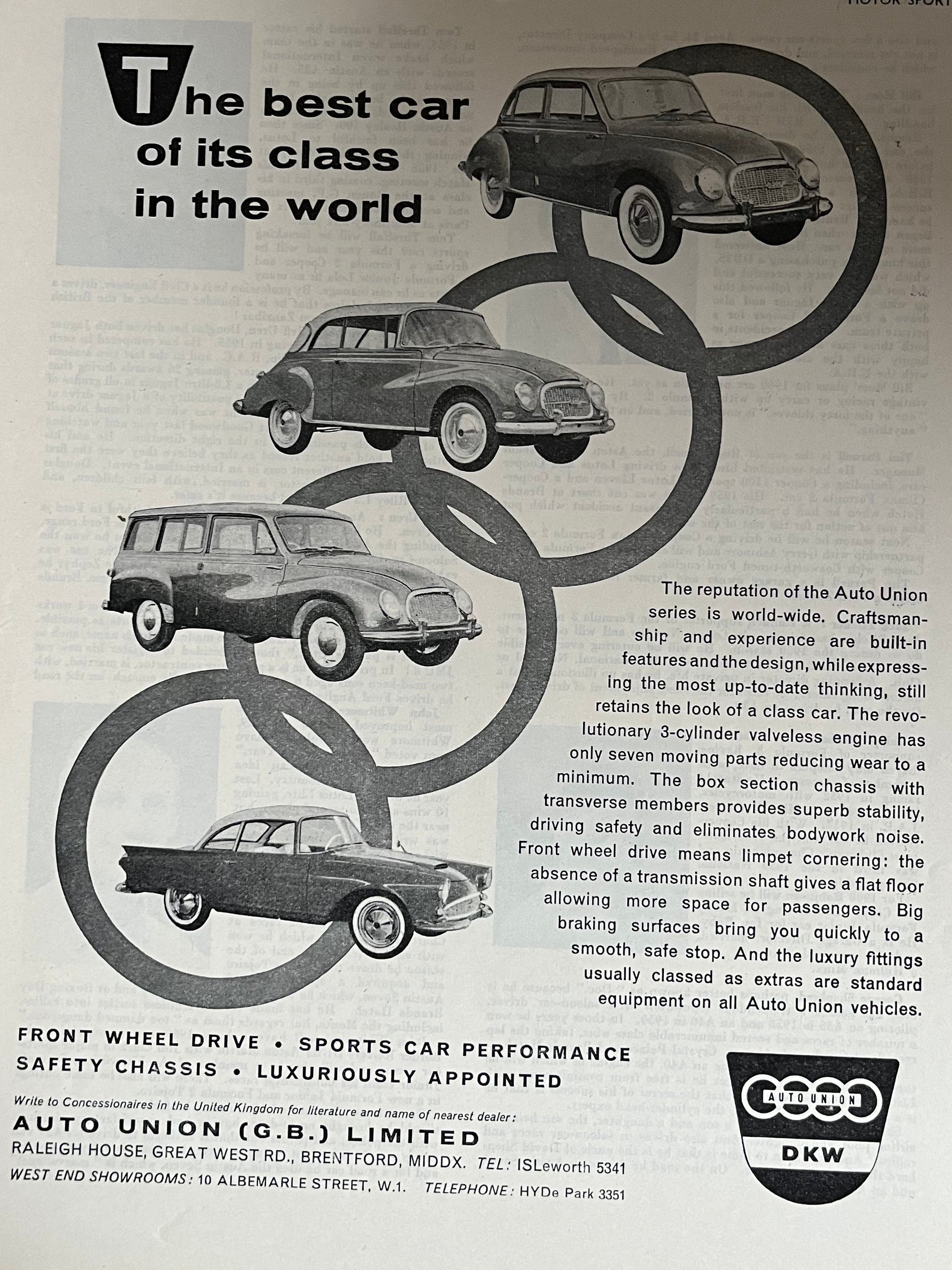 A Set of three original 1960s advertisements for Audi / Auto Union cars. All are card mounted ready for framing.